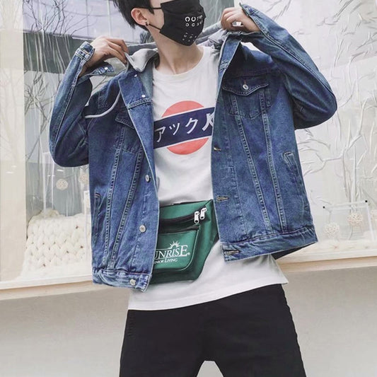 Blue Denim Detachable Hooded Jackets Mens Vintage Kpop Streetwear Guy