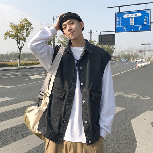Black Denim Vests Waistcoats Mens Vintage Kpop Casual Streetwear Outer