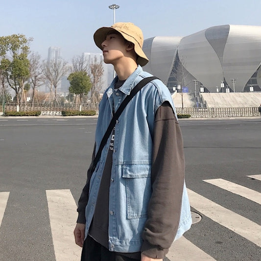 Blue Denim Vests Waistcoats Mens Vintage Kpop Casual Streetwear Outer