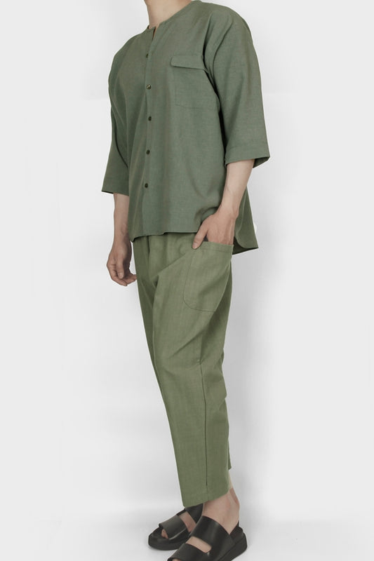 Khaki Non Collar Casual Shirts Mens Tops Summer 3/4 Sleeves Clothing