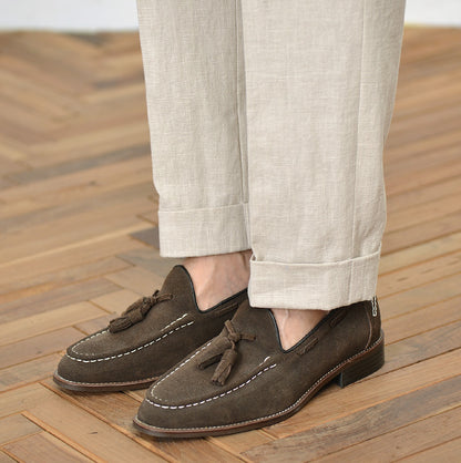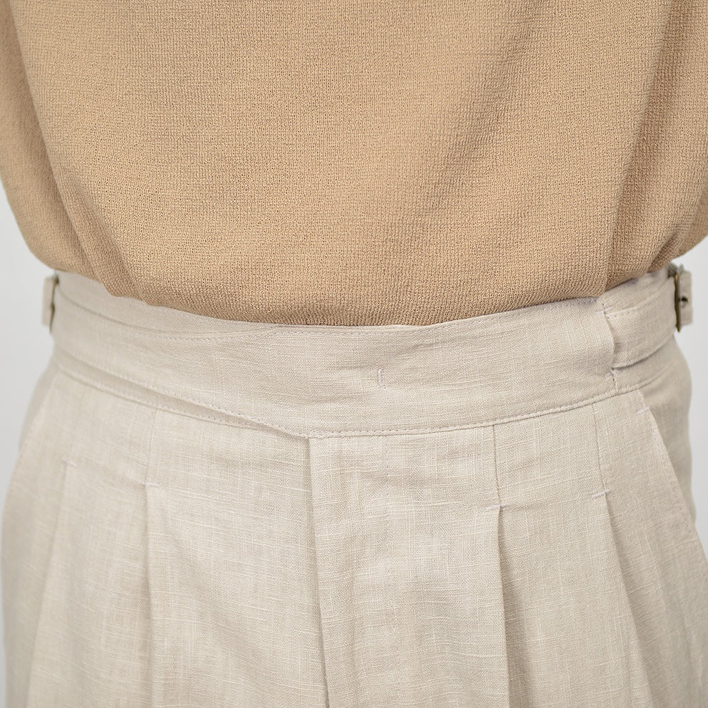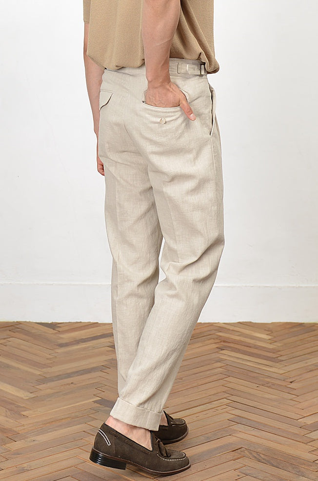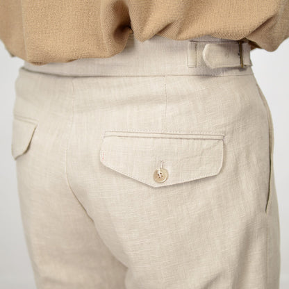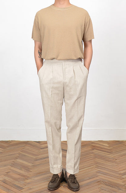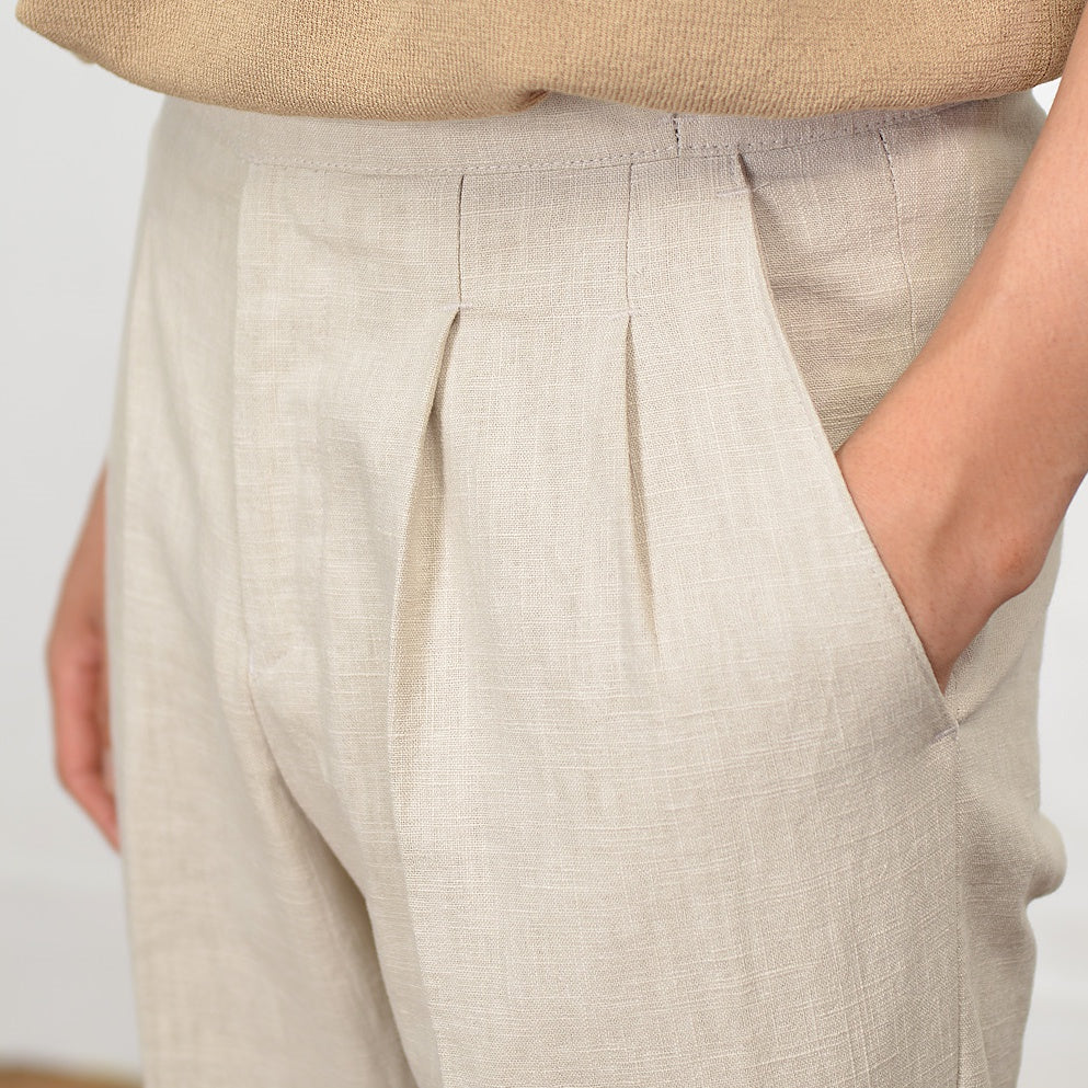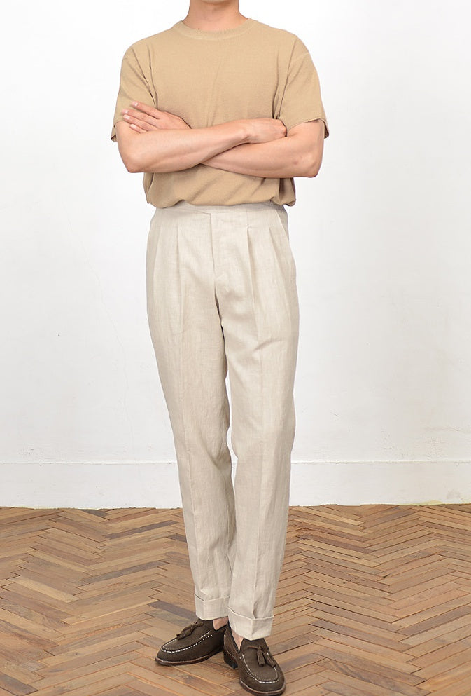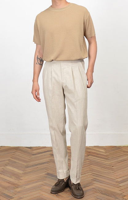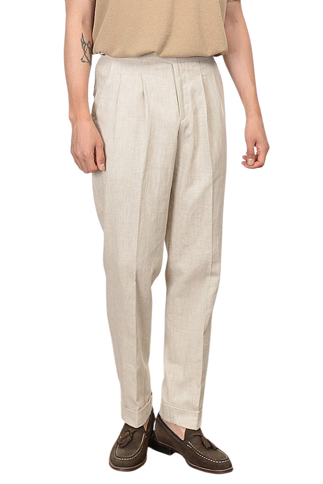Beige Linen Two Tucked High Waist Trousers Mens Relaxed Pleated Pants