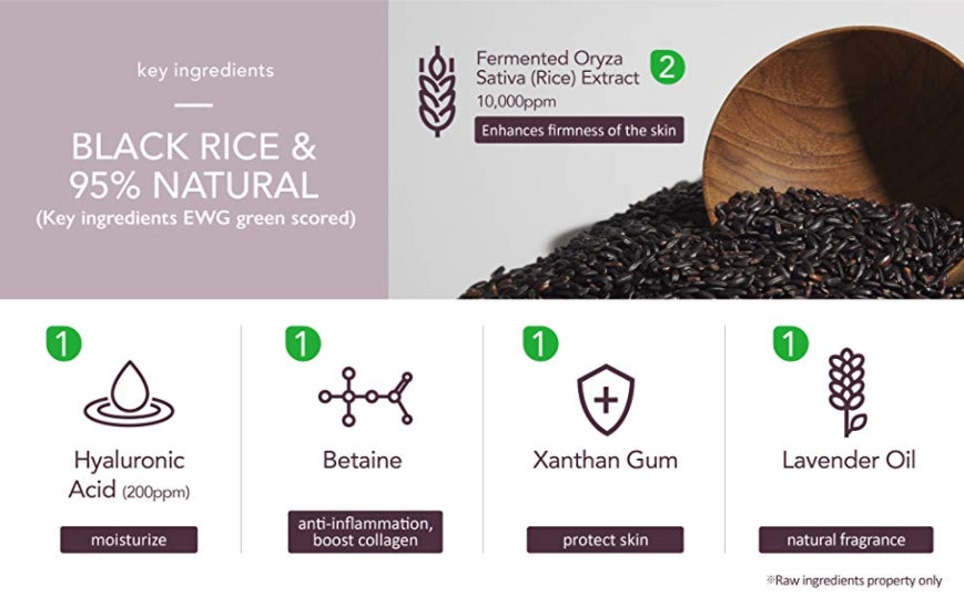 Black rice is rich in anti-oxidants and is full of highly concentrated polyphenol and flavonoid pigments which protects skin against free radicals, including ultraviolet radiation and pollution, and encourage new cell growth.