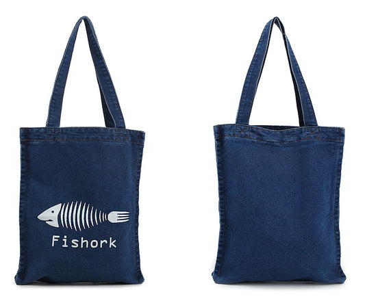 Blue Fishork Printed Denim Totes Shoulder Handbags