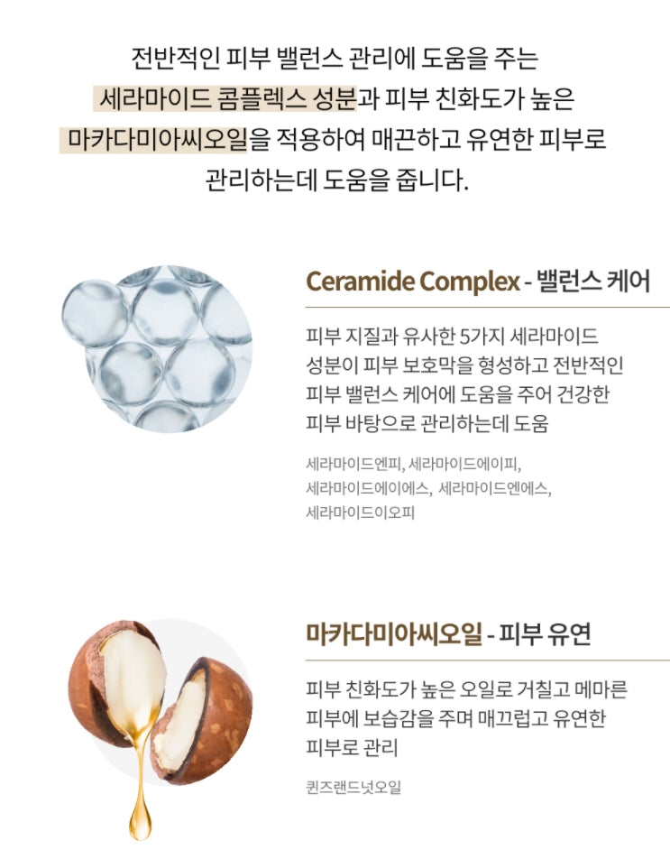 Ceramide complex, which helps to maintain overall skin balance, and macadamia seed oil with high skin affinity, help to maintain smooth and flexible skin.