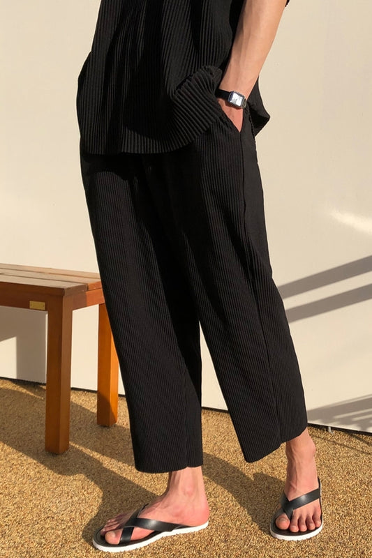 Black Pleated Capri Pants Mens Loose Fit Trousers Causal Waistband Guy