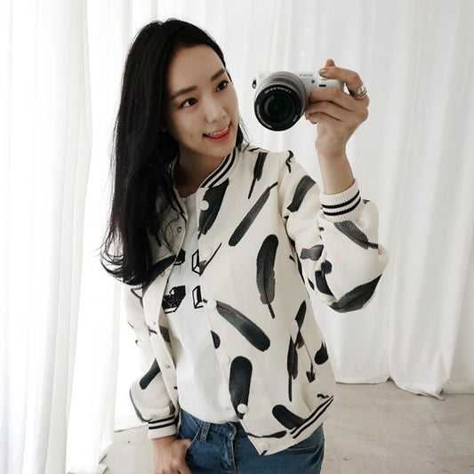 Ivory Feather Pattern Varsity-Striped Baseball Jackets