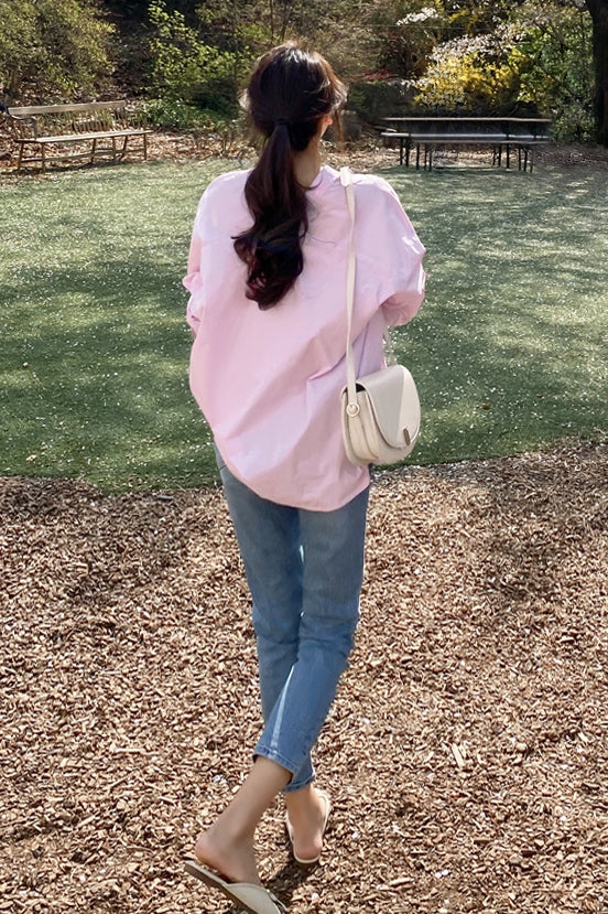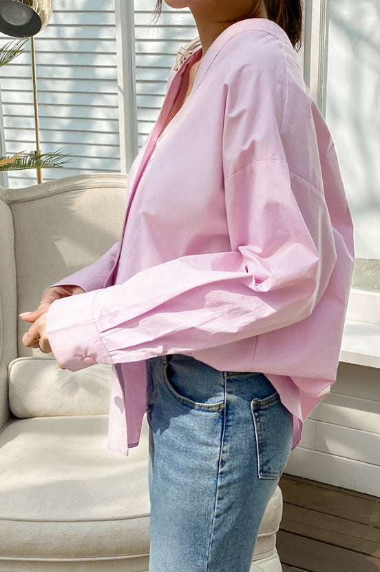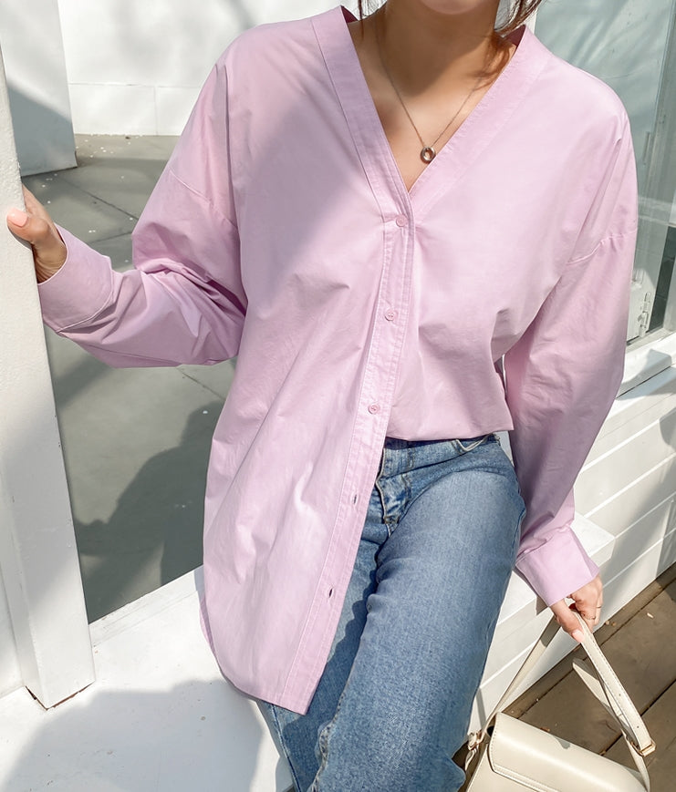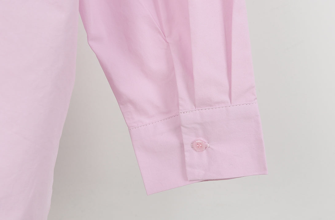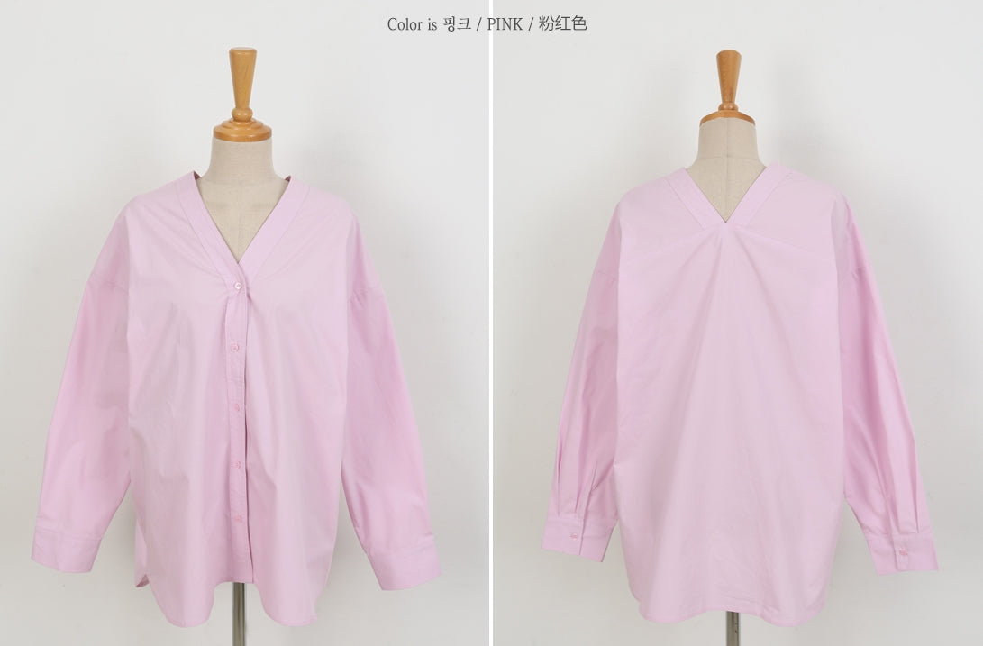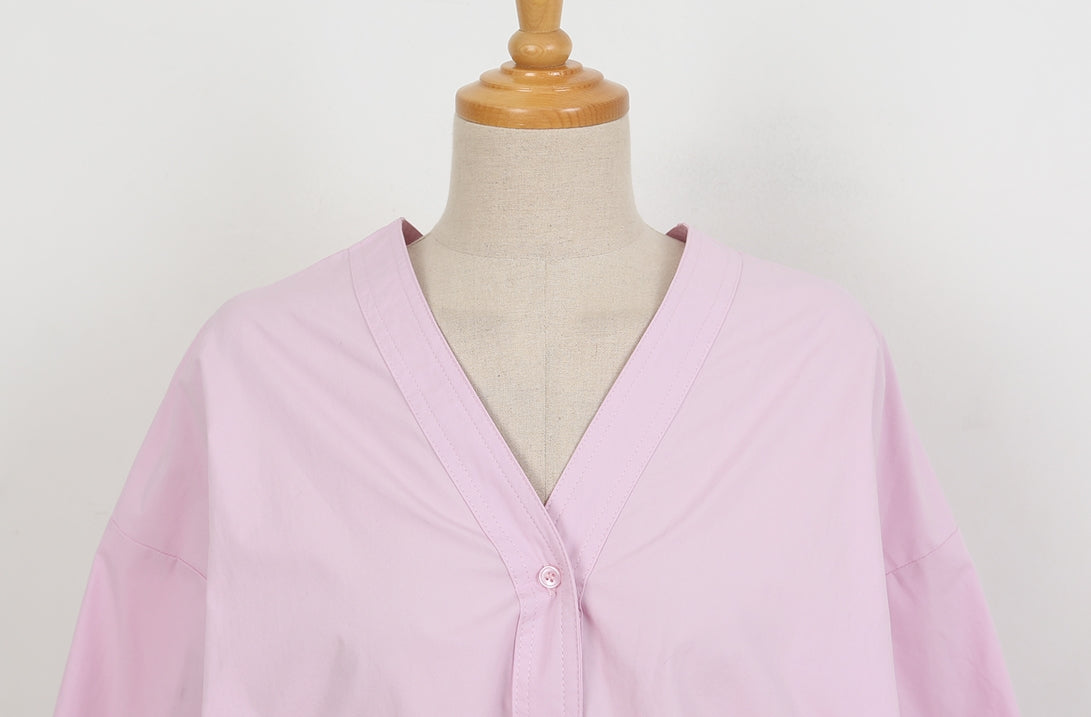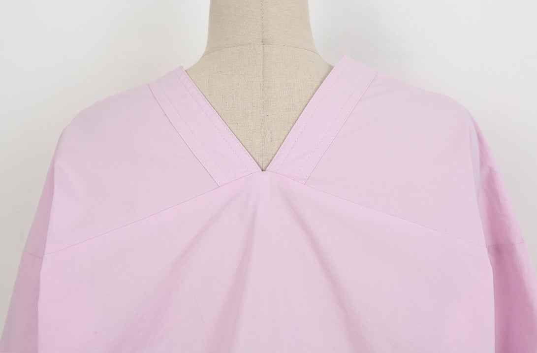 Pink Non Collar V-Neck Cotton Shirts Career Woman Korean Style