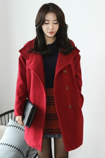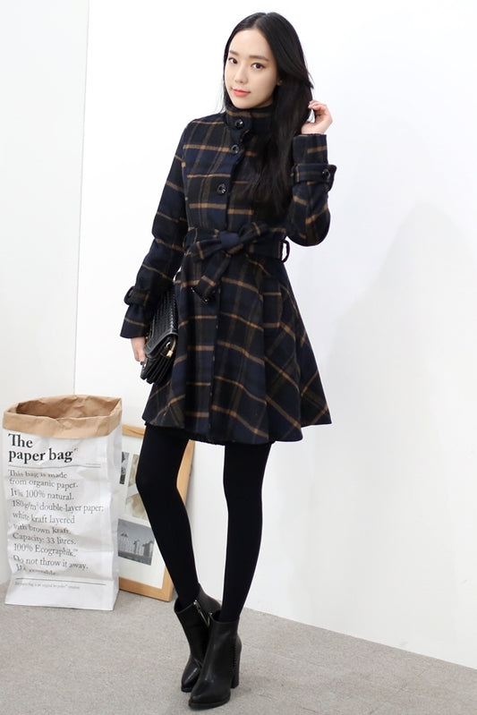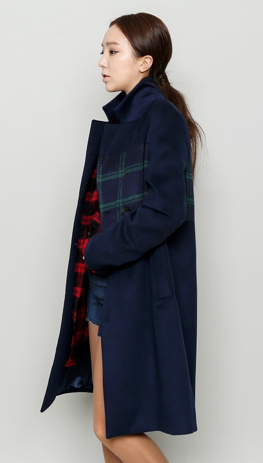 Navy Blue Tartan Plaids Panel Double Breasted Coats