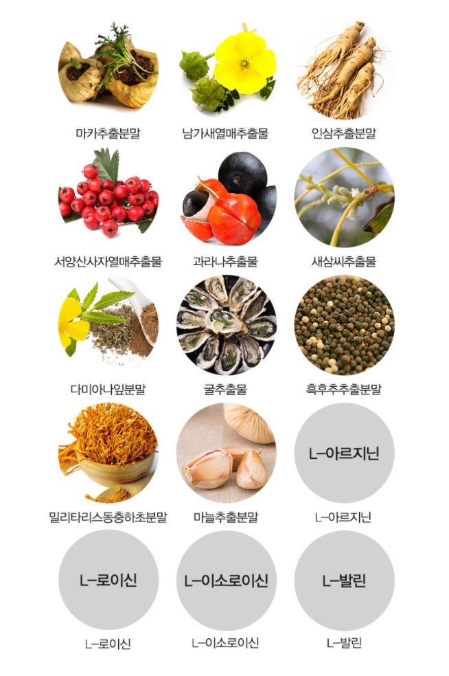 14 auxiliary ingredients: maca extract powder, namgasae fruit extract, ginseng extract powder, wild lion fruit extract, guarana extract, ginseng seed extract, damiana leaf powder, oyster extract, black pepper extract powder, militaris cordyceps powder, garlic extract powder, L-arginine, L-leucine, L-isoleucine, L-valine.