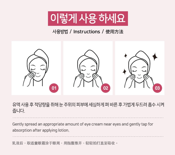 How to use: After using the lotion, take an appropriate amount, apply carefully to the skin around the eyes, and pat lightly for absorption.