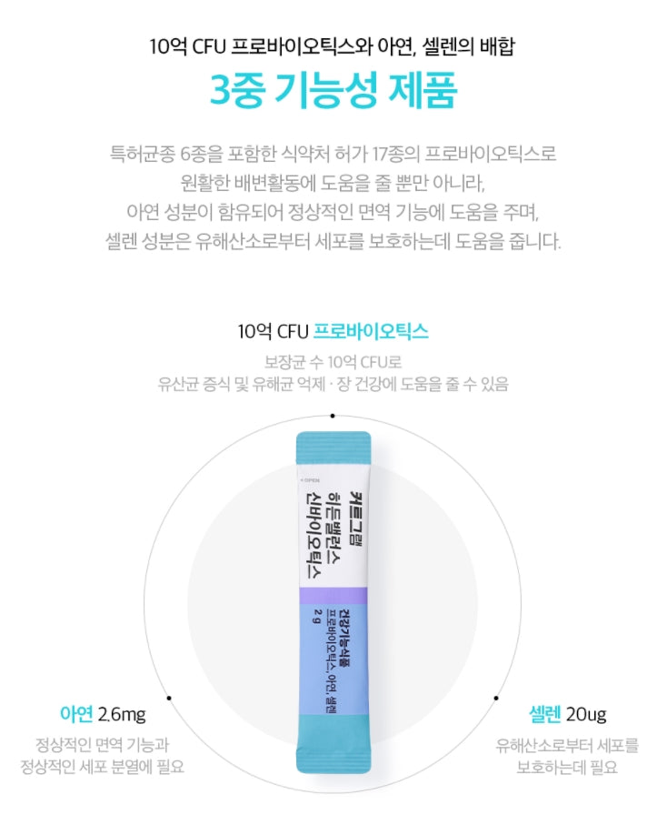 17 kinds of probiotics with 1 billion CFU of guaranteed bacteria, zinc, and selenium are applied together to improve intestinal health and take care of normal immune function.
