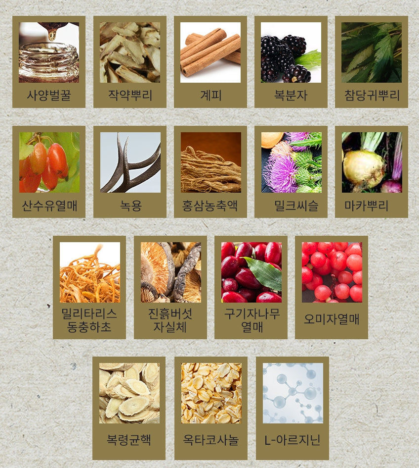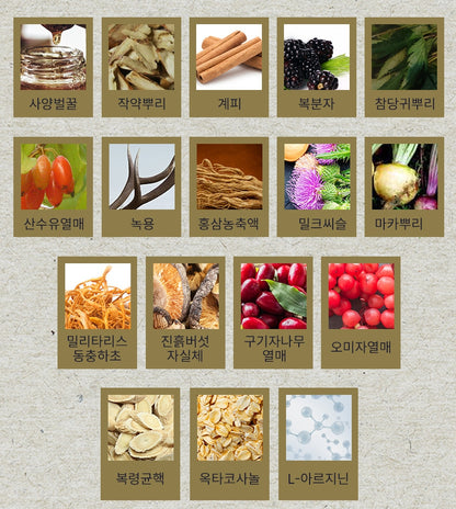 17 kinds of auxiliary ingredients: Sprout honey, peony root, cinnamon, bokbunja, Angelica root, cornflower fruit, deer antler, red ginseng concentrate, milk thistle, maca root, militaris cordyceps, mud mushroom fruiting body, goji berry fruit, omija fruit , Bokryeong sclerotia, octacosanol, L-arginine.
