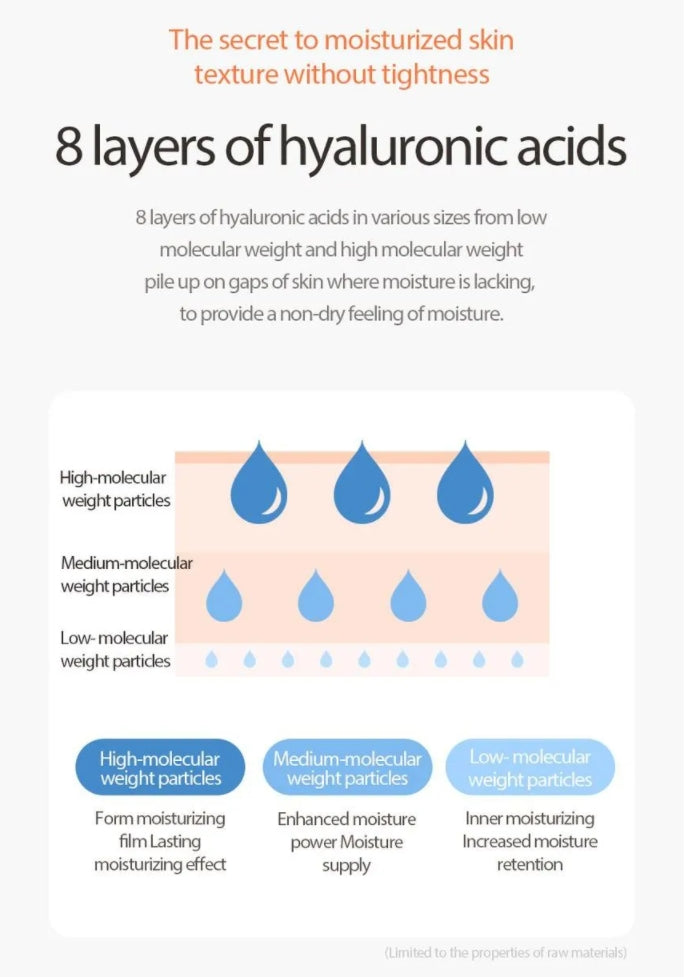 8 kinds of Hyaluronic Acid with different molecular weight offer deep and long-lasting hydration.