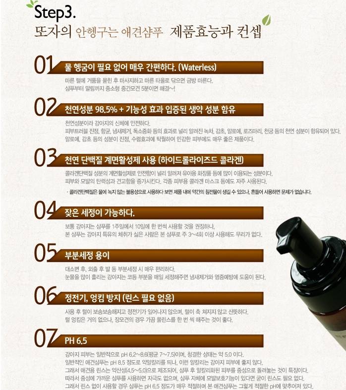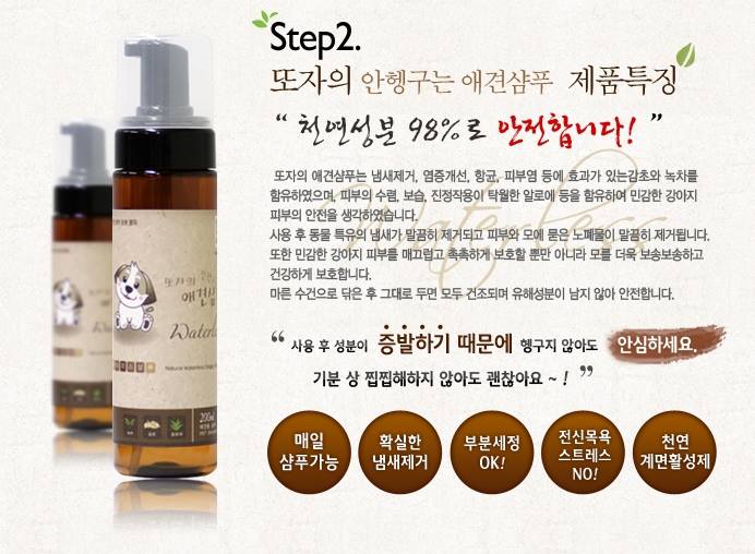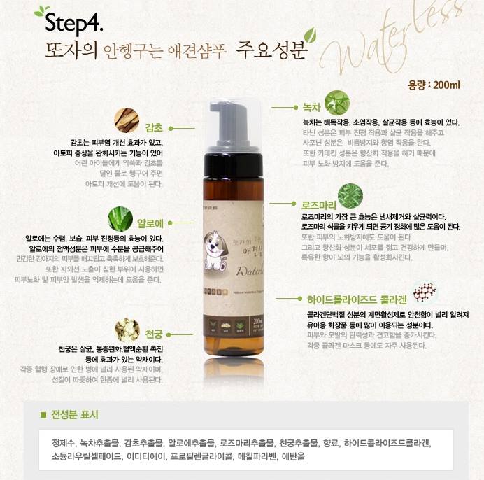 This product keeps the skin barrier properly so that the skin does not dry after use. As the remaining ingredients evaporate after use, the fur is soft and the dog's unique smell disappears, making it fragrant even if it is put to sleep every day. It is made of natural ingredients and has no irritation to the skin. Since it is not rinsed with water, it is recommended to prevent skin diseases with shampoo that is very useful for removing stains or odors locally, such as urination, partial cleansing after defecation, and washing feet after going out.