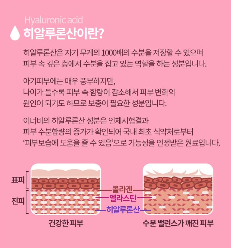 Innerb Aqua Bank, which can be easily taken 2 tablets per day, contains hyaluronic acid, an essential component of the skin.