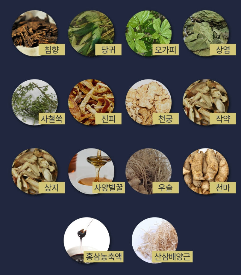 Aloes Hyang (Indonesia) 22%, Angelica Root Mixed Powder [Anggui (Domestic) 18%, Orchidaceae (Domestic) 18%, Upper Leaf (Domestic) 18%, Perennial Mugwort (Domestic) 18%, Dermis (Domestic) 18%, Licorice ( Foreign) 5%, Cinnamon (foreign) 5%] 18%, Chun-Gung Mixed Powder [Chun-Gung]