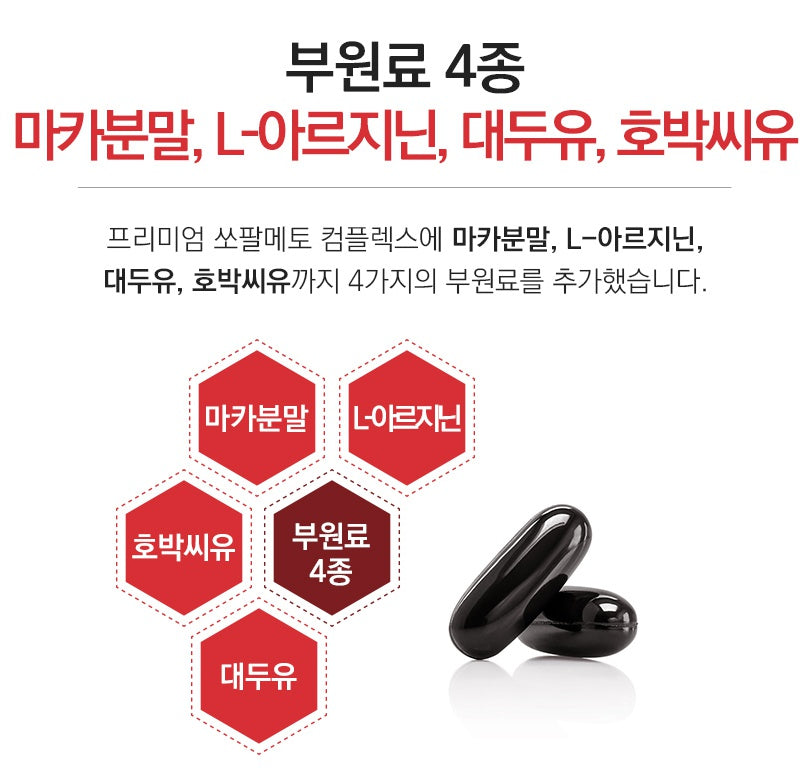 Saw palmetto fruit extract, octacosanol (sugar cane), vitamin B1 hydrochloride, vitamin B2, pyridoxine hydrochloride, vitamin B12, d-a-tocopherol, zinc oxide, soybean oil, beeswax, maca powder, pumpkin seed oil, L-arginine.
