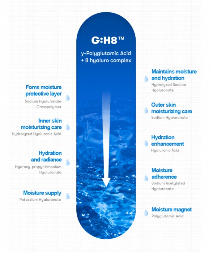 Ingredients : Purified Water, Glycerin, Stearic Acid, Lauric Acid, Palmitic Acid, Potassium Hydroxide, Myristic Acid, PEG-32, Cocamidopropyl Betaine, Glyceryl Stearate, Sodium Hyaluronate (8ppm), Hyaluronic Acid (0.3ppm), Hydrolyzed Hyaluronic Acid (0.3ppm), Hydroxypropyltrimonium Hyaluronate (0.3ppm), Hydrolyzed Sodium Hyaluronate (0.3ppm), Sodium Hyaluronate Crosspolymer (0.3ppm), Potassium Hyaluronate (0.3ppm), Sodium Acetylated Hyaluronate (0.01ppm), Glycine, Serine, Glutamic Acid, Aspartic Acid, Leucine, Alanine, Threonine, Lysine, Arginine, Tyrosine, Phenylalanine, Proline, Valine, Isoleucine, Histidine, Methionine, Cysteine, Malva Sylvestris (Mallow) Extract, Aloe Vera Leaf Extract, Dioscorea Japonica Root Extract, Hibiscus Esculentus Fruit Extract, Sea Water, PCA, Butylene Glycol, Abronia Villosa Leaf Extract, Cinchona Succirubra Bark Extract, Psidium Guajava Leaf Extract, Rhodiola Rosea Root Extract, Poterium Officinale Root Extract, Lotus Flower Extract, Pelargonium Graveolens Extract, Cinnamomum Zeylanicum Bark Extract, Uncaria Gambir Extract, Papain, Sodium Benzoate, PEG-100 Stearate, Sorbitol, Sodium Chloride, Acrylate/C10-30 Alkyl Acrylate Crosspolymer, Corn Starch, Potassium Cocoyl Glycinate, Methylarachidic Acid, PEG-14M, Polyquaternium-7, Oleic Acid, Capric Acids, Maltodextrin, Hydroxypropylmethyl Cellulose, Dipropylene Glycol, Sodium Carbomer, Silica, Sodium Metabisulfite, Polyglutamic Acid, Pentylene Glycol, Disodium EDTA, 1,2-Hexanediol, Ultramarine, Fragrance.