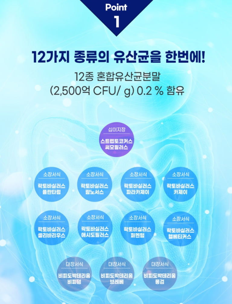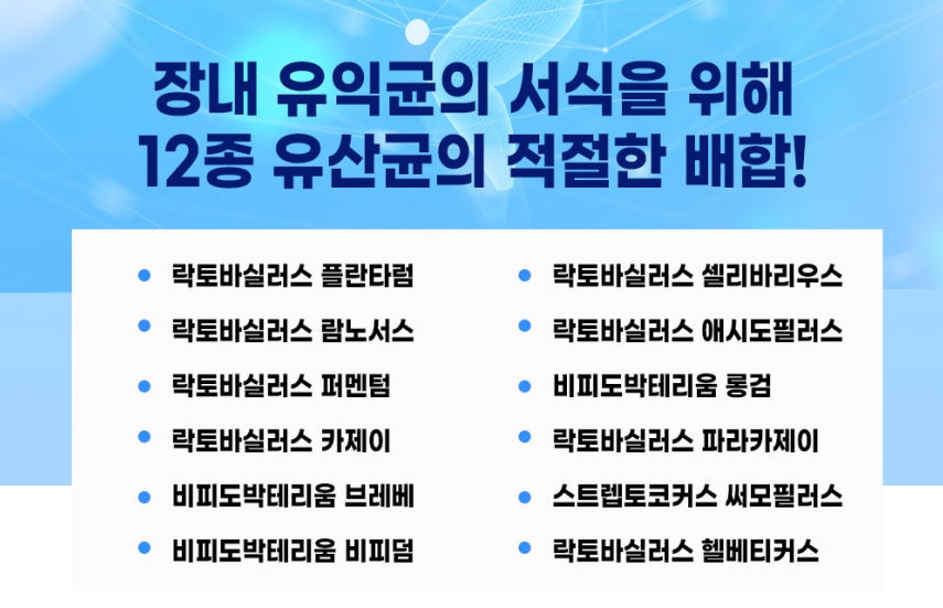 12 kinds of lactic acid bacteria are properly formulated for the inhabitation of beneficial intestinal bacteria.