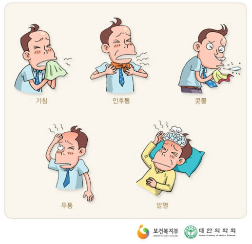 Runny nose, stuffy nose, sore throat, sneezing, chills, fever, headache, joint pain, muscle pain.