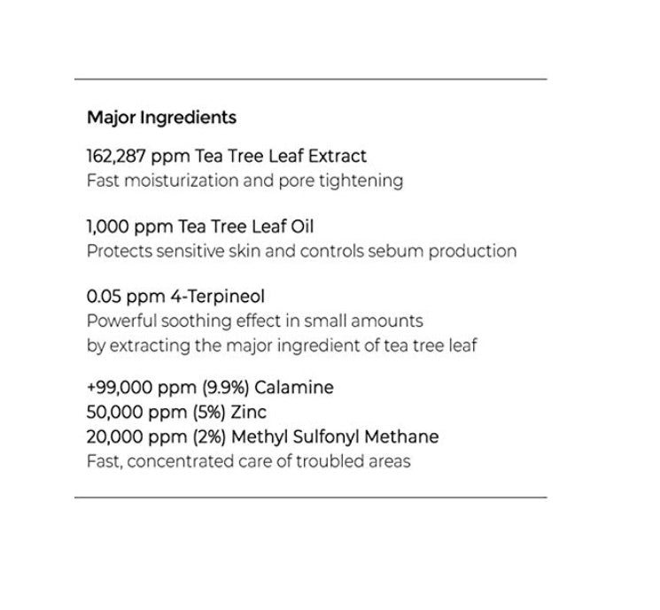 Intensive Spot-Concentrated Care Treatment: Pink calamine powder and tea tree create a synergistic effect to control excessive sebum and provide concentrated speedy care treatment for troubled areas.