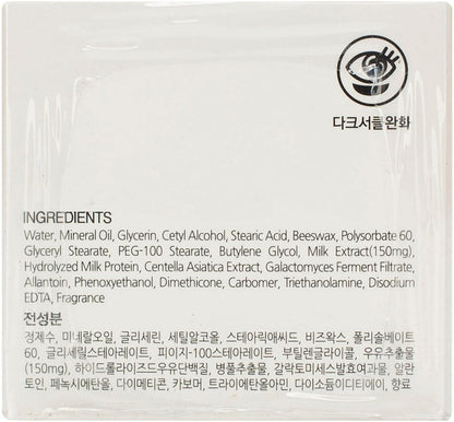 Material : Water, mineral oil, glycerin, cetyl alcohol, stearic acid, beeswax, polysorbate 60, glyceryl stearate, PEG-100 stearate, butylene glycol, milk extract, centella asiatica extract, galactomyces fermentation filtrate , Allantoin, phenoxyethanol, dimethicone, dimethicone disodium EDTA, fragrance.