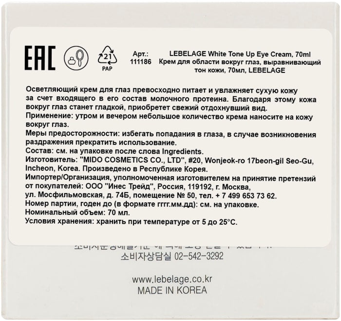 The cream from Korea's famous brand LEBELAGE Eye Cream White Tone Up creams to brighten the epidermis around the eyes.