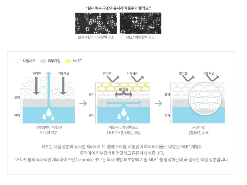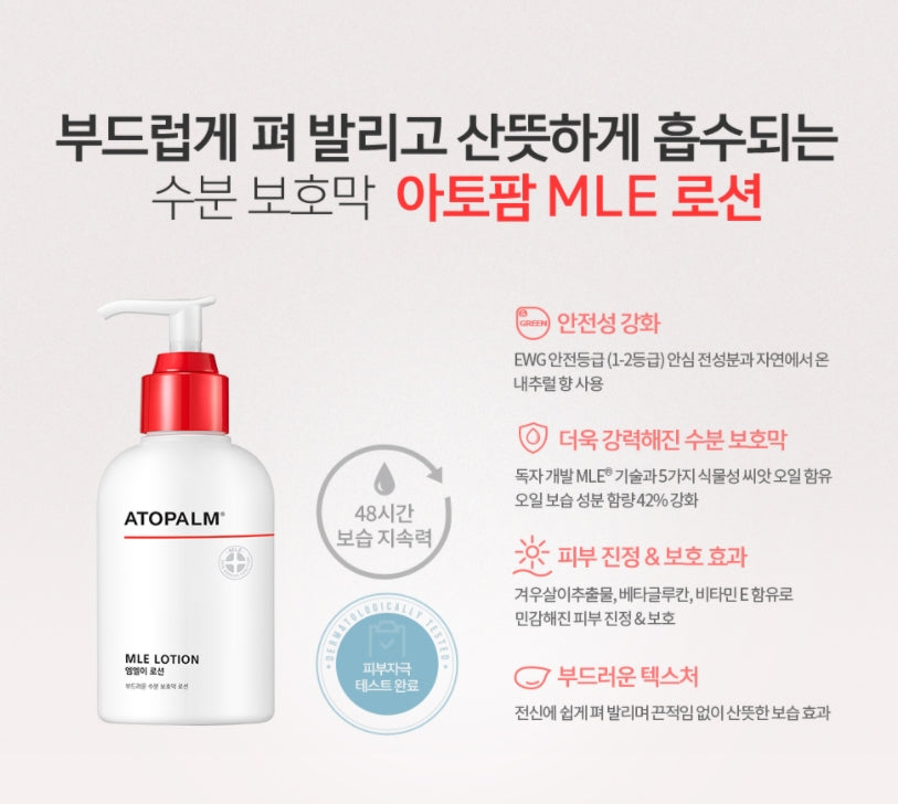 After washing the face or taking a shower, dry your skin with a towel. Sufficiently apply product onto dry face, arms, legs, and other affected parts to allow product to be absorbed. To make skin more soft and moist-dry and sensitive areas in particular-additionally apply Atopalm MLE Cream after every application of the Atopalm MLE Lotion.
