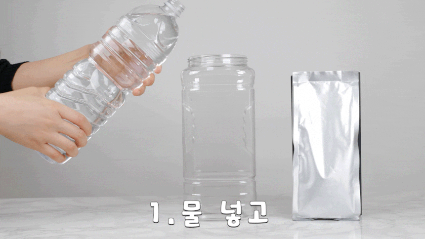 -Pour 1 powder and 1 enzyme powder into the water.