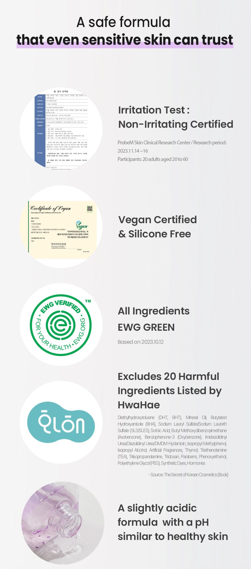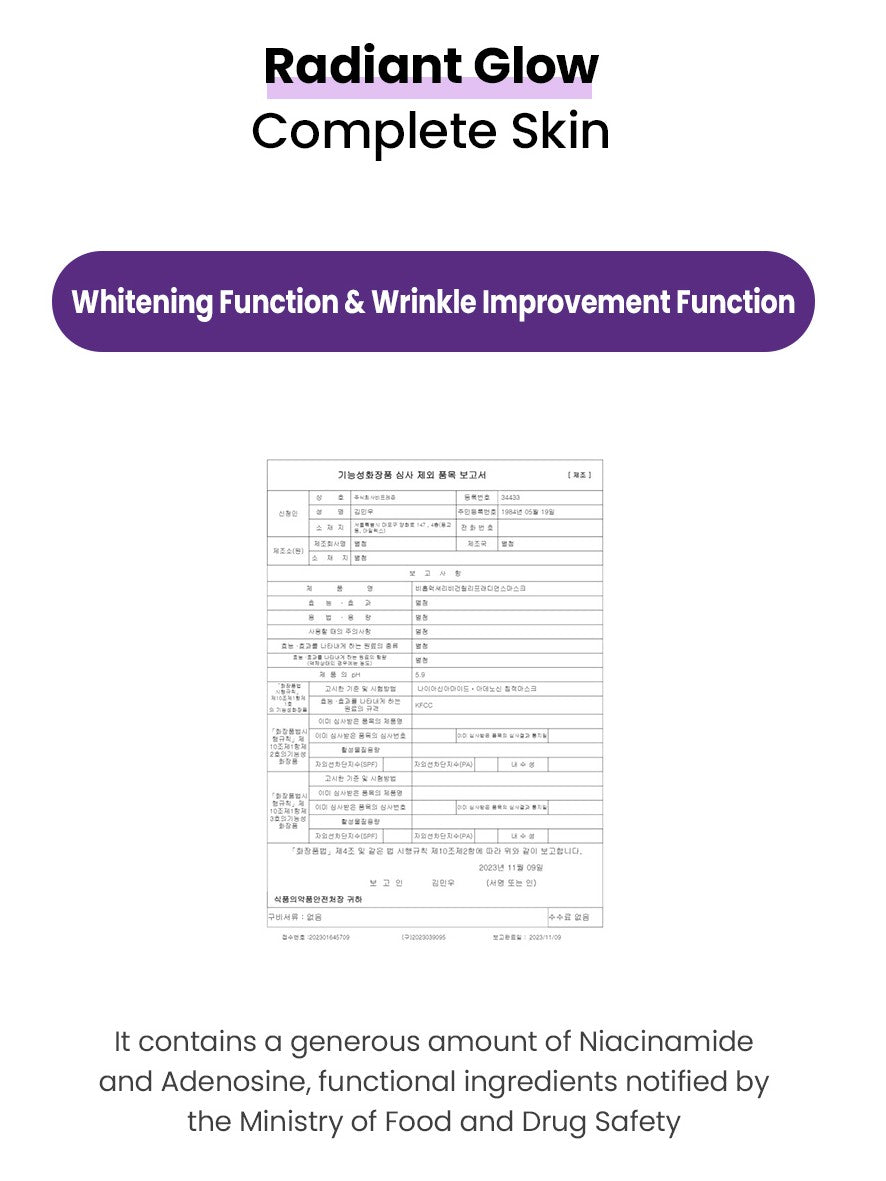 Purified water, butylene glycol, propanediol, niacinamide, glycerin, betaine, hydroxyacetophenone, carbomer, panthenol, allantoin, tromethamine, 1,2-hexanediol, ethylhexylglycerin, adenosine, indomulthoracic tree flower extract, sodium hyaluronate, disodium Edithiae, potmarigold flower extract, daisy flower extract, ivy god fruit extract, green tea extract, hydrolized hyaluronic acid, sodium acetylated hyaluronate.