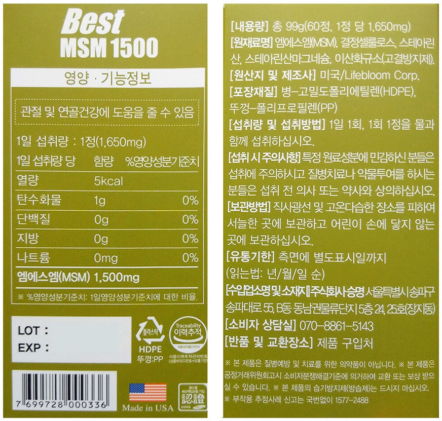 Ingredients: MSM (MSM, crystalline cellulose, stearic acid, magnesium stearate, silicon dioxide (anti-caking agent).
