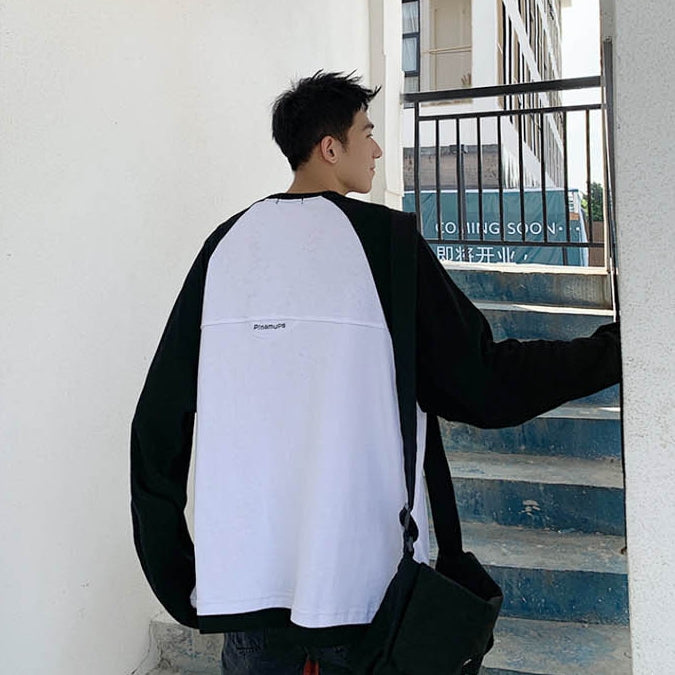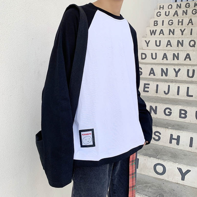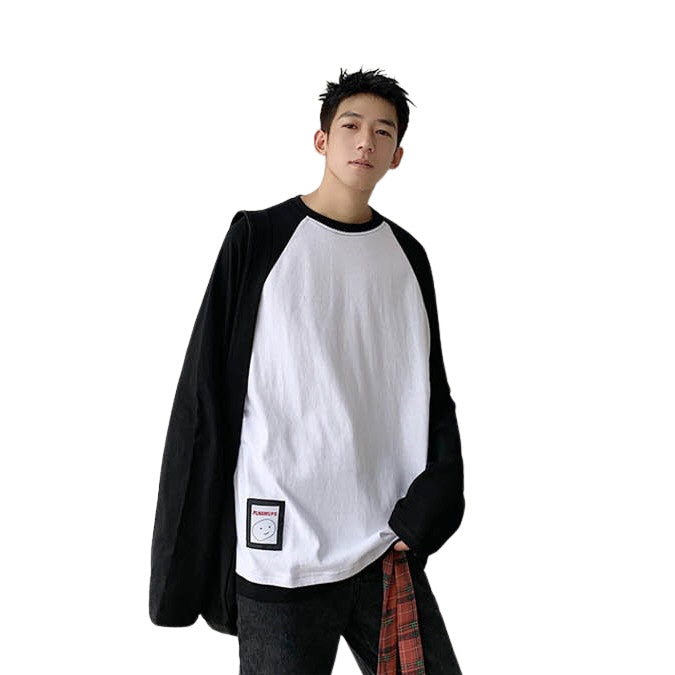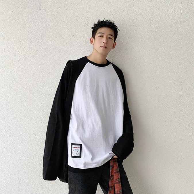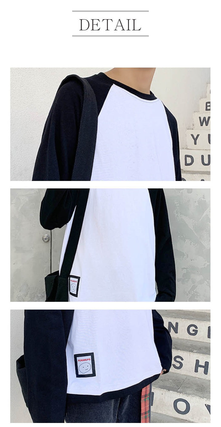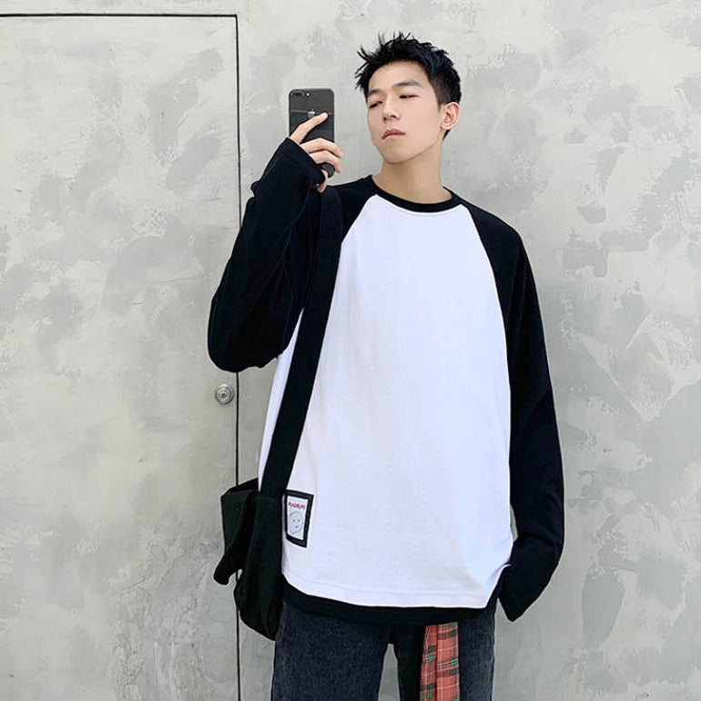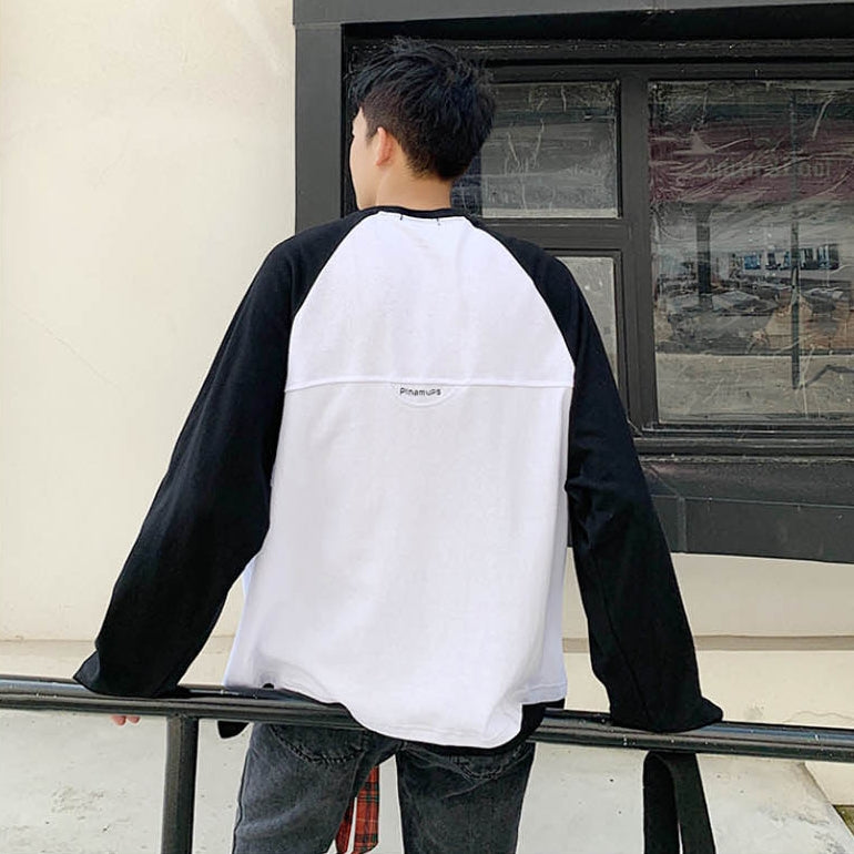 Casual crewneck long sleeved t-shirts for men. Color blocked baseball tees with long raglan sleeves. Korean style baseball tops for everyday, picnic, weekend.