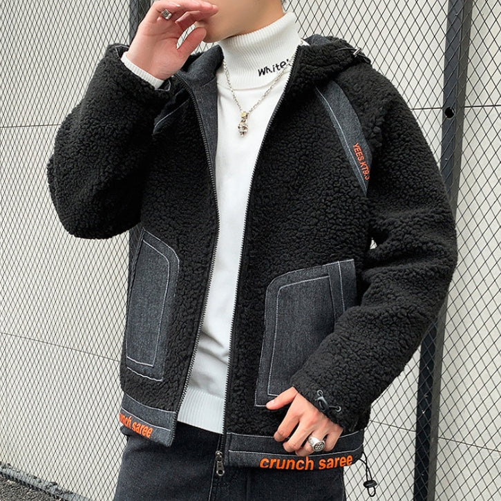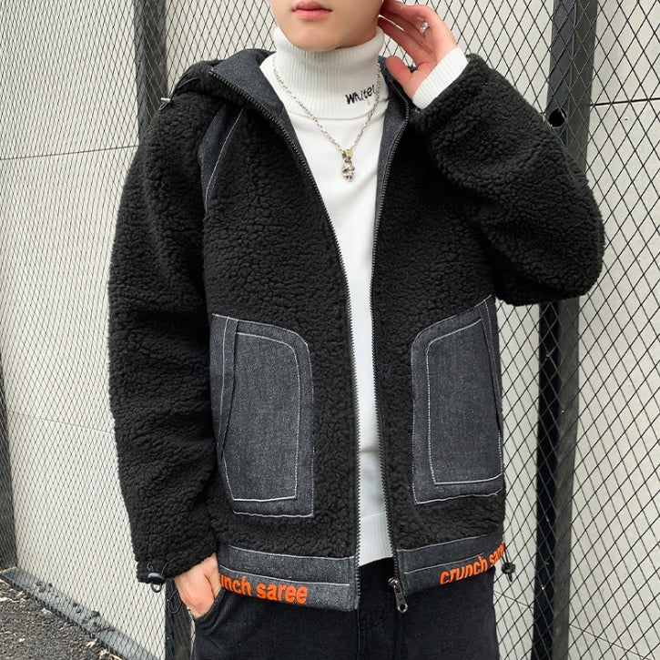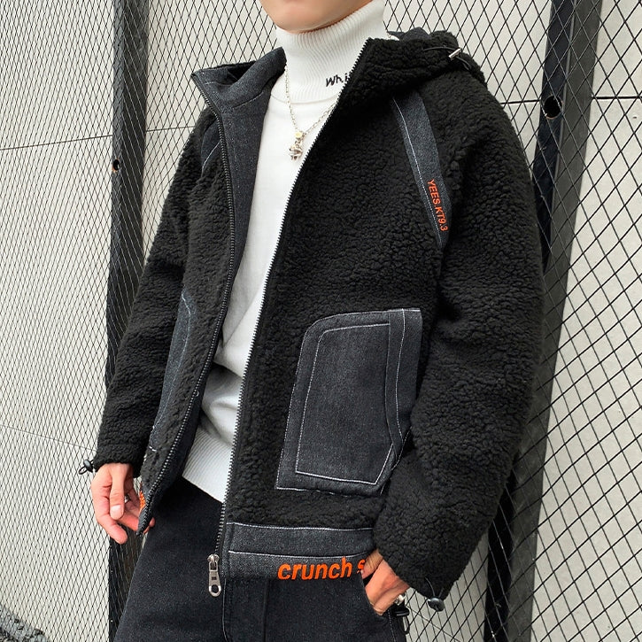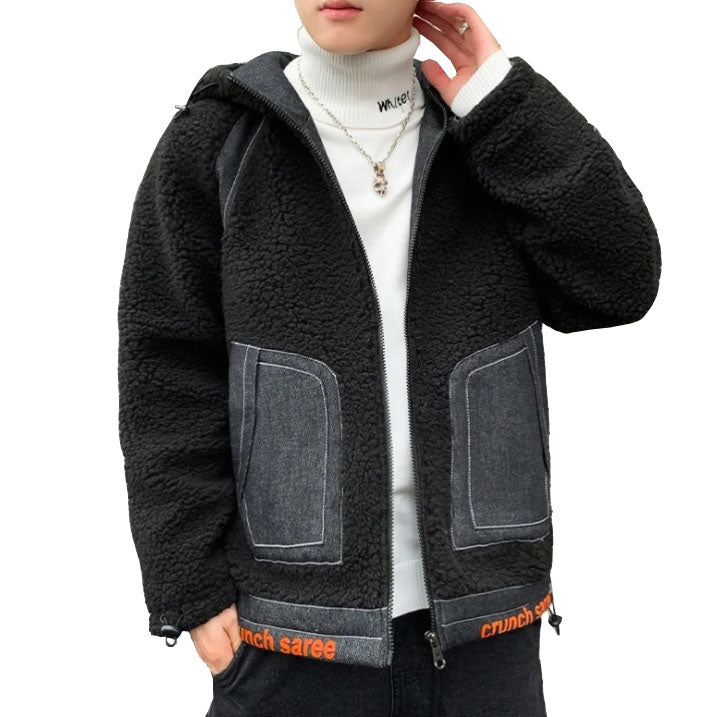 Novelty outerwear hooded jackets for men. Shearling denim hybrid hoodies with graphic, keep warm and stylish. Casual, hip-hop, kpop style fashion streetwear.