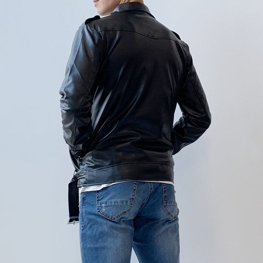 Brand new faux leather jackets for men. Zipper closure outfits, Motorcycle biker jackets with long sleeves. Stylish jacket for weekend, clubber, riding, picnic.