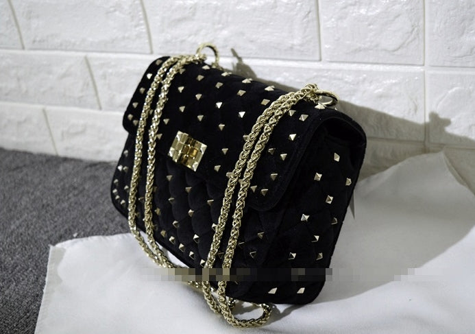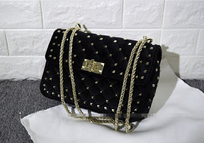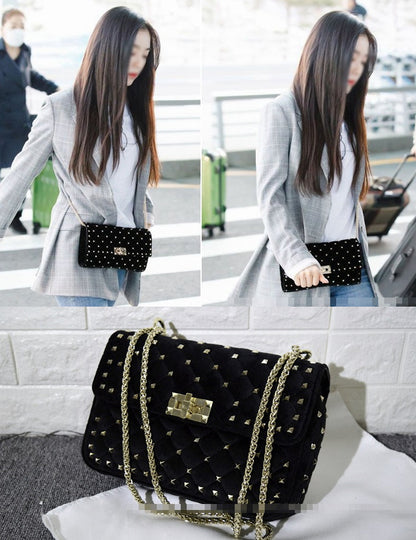 Newest Kpop fashion handbags for women. Studded trim and velvet material, chain strap for srossbody or shoulder. Use for party, dinner, clubber, dating.
