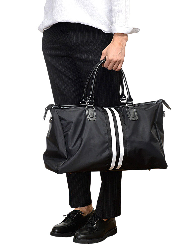 Fashionable duffel bags for men. Solid with striped luggage for school, business, travel, picnic. There is detachable crossbody strap, adjustable. Zipper closure, stylish duffel handbags with top tote handle.