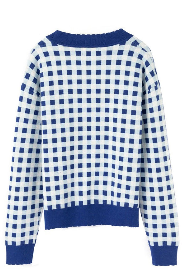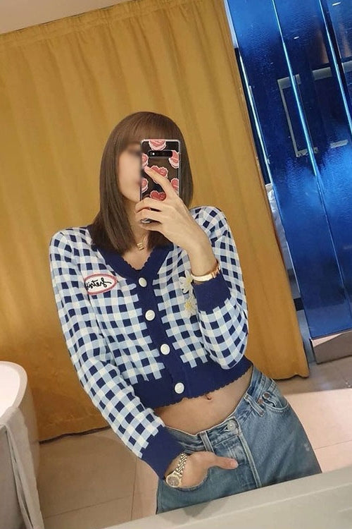 Blue Plaids Cropped Cardigans Womens V-Neck Blackpink Lisa Kpop Star