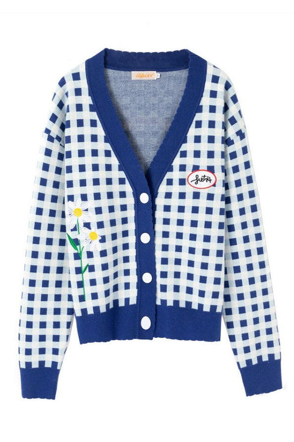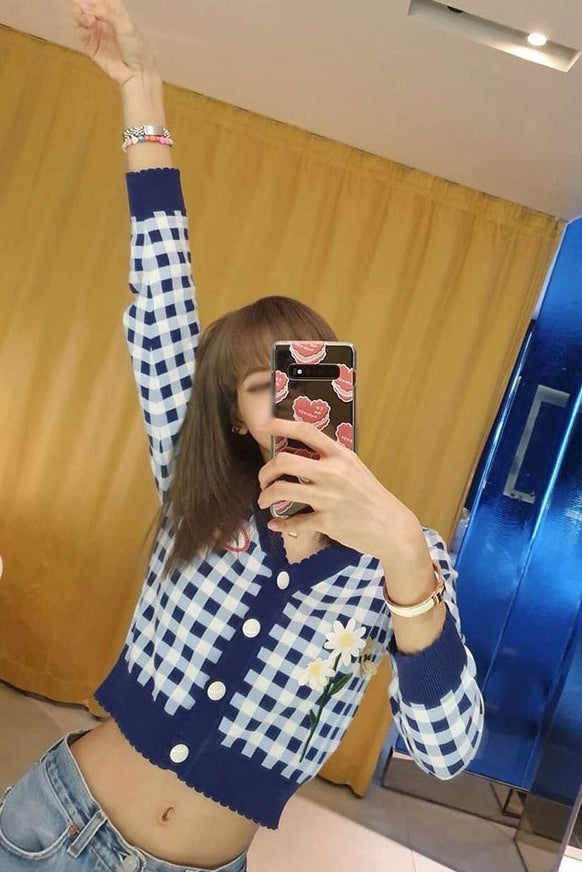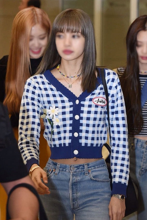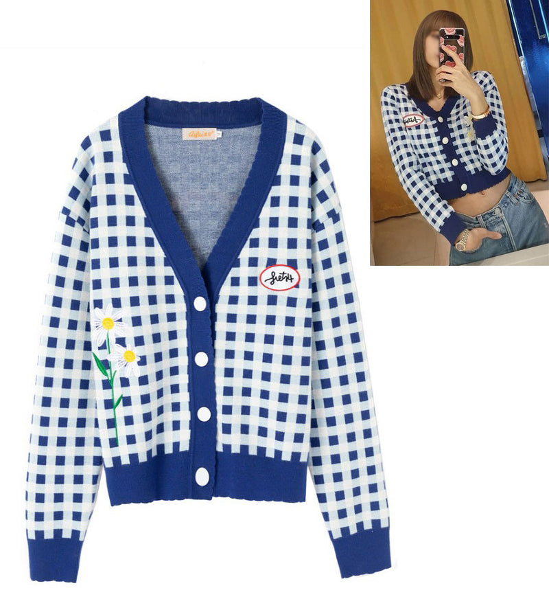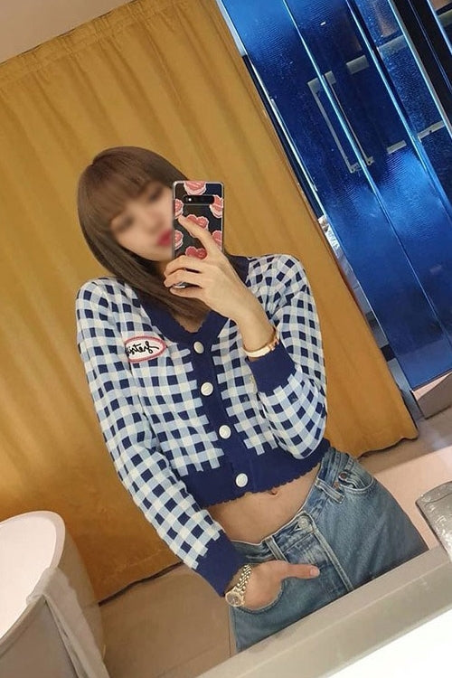 Newest Korean K-pop fashion clothing, cropped v-neck cardigans for women and girls. K-pop girl LISA of BLACKPINK, plaids buttoned cardigan is so fashionable.