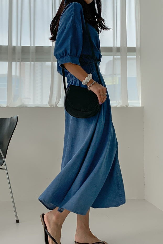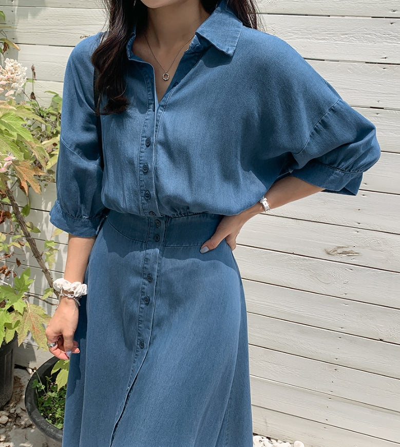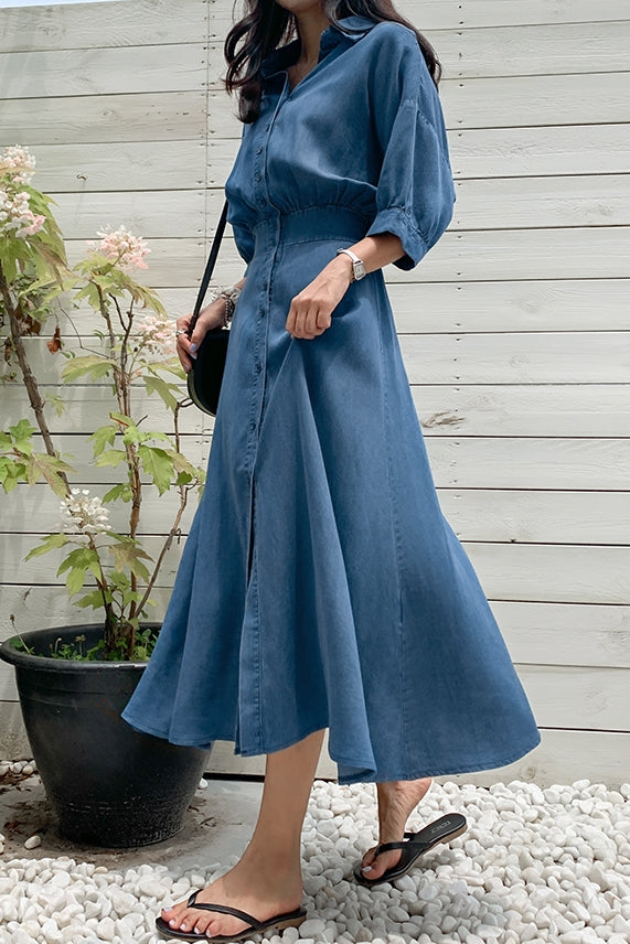 Vintage denim shirt dresses for women. Dolman sleeves, maxi long length, A-line dresses. Wear for dating, vacation, picnic, weekend. Soft tencel denim material.