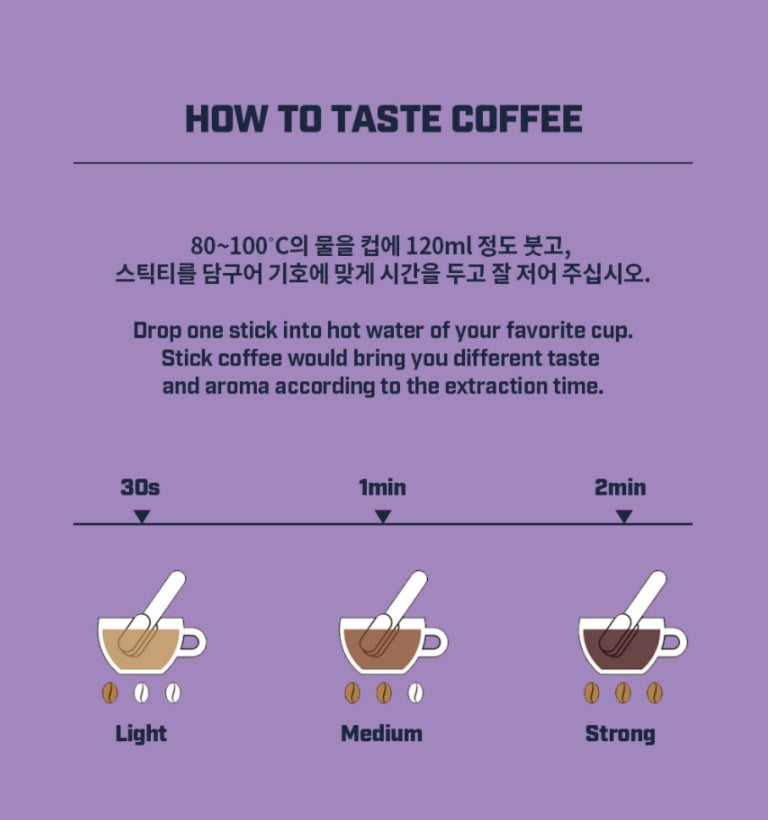How to taste coffee: Pour 120ml of 80~100℃ water into a cup, dip the stick tea in it, and stir well for a while to suit your taste.