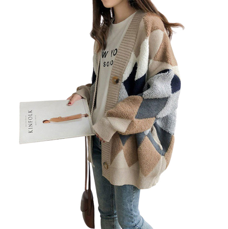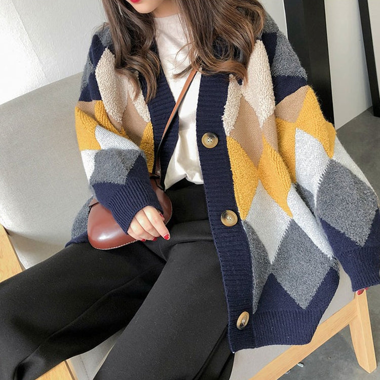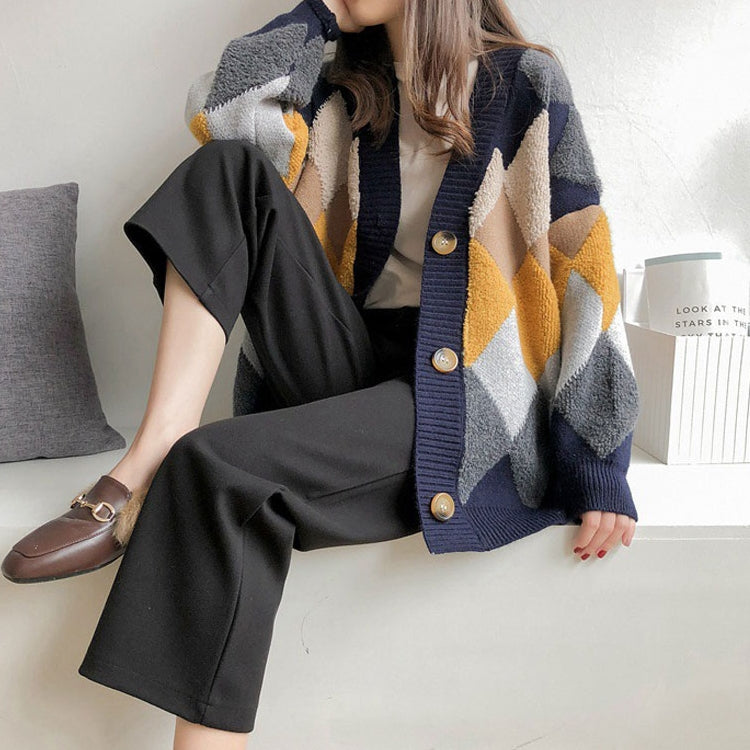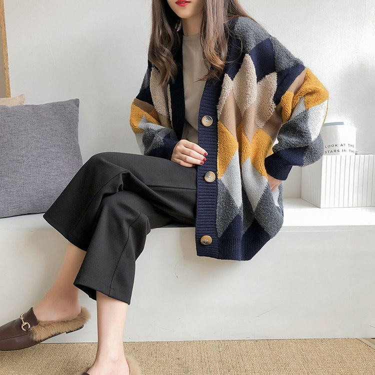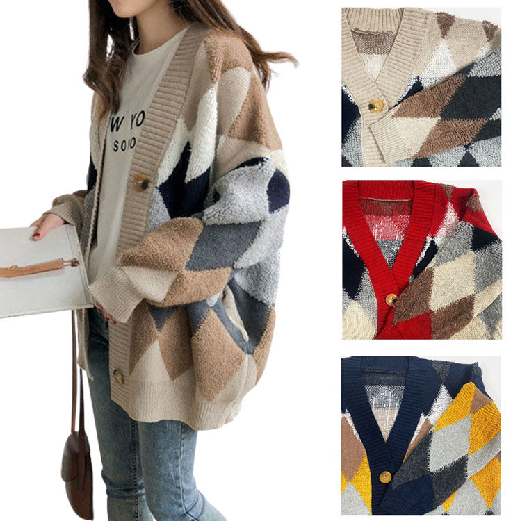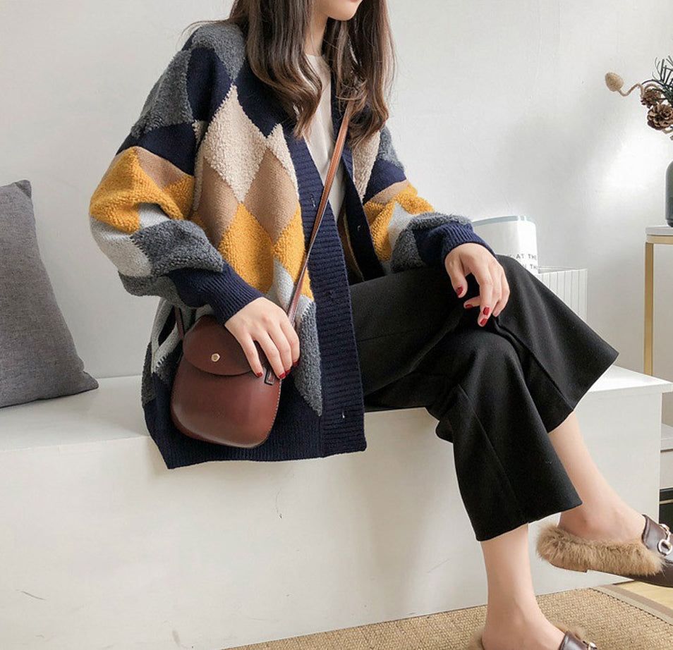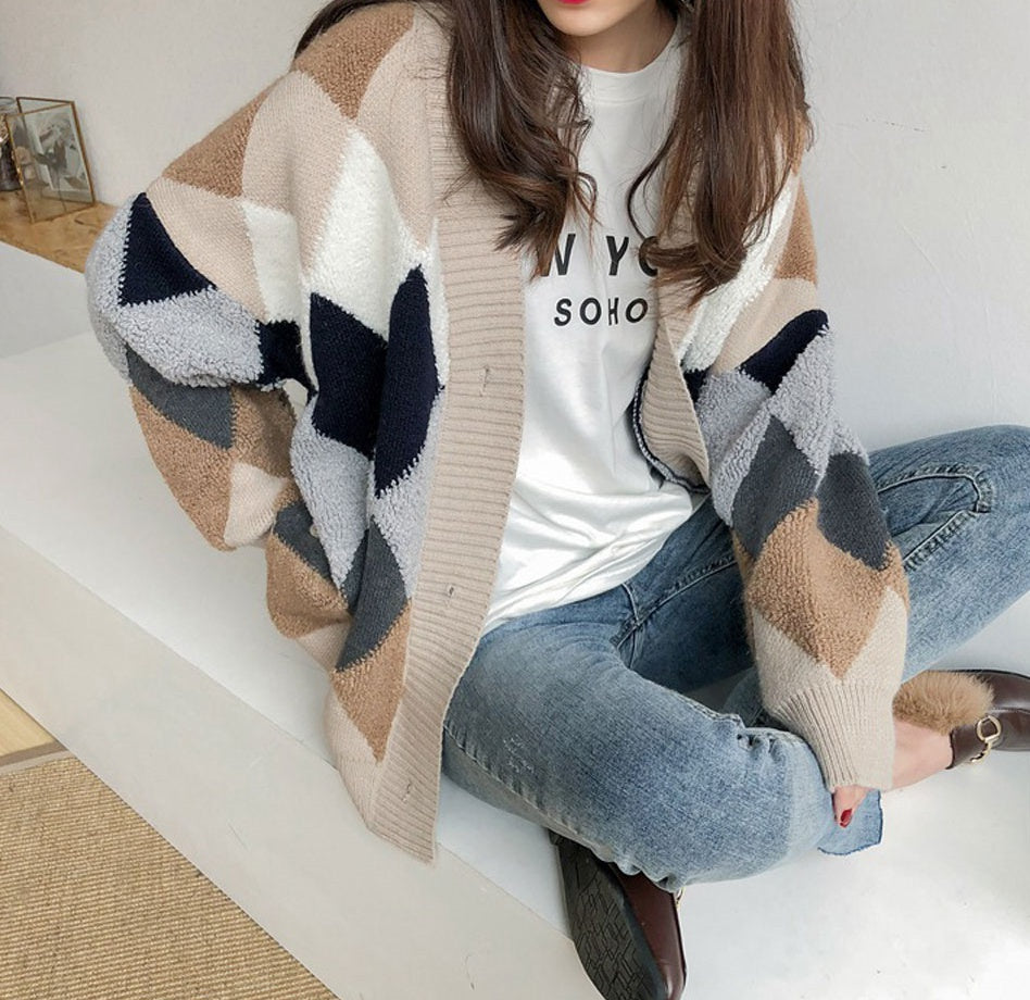 Casual V-neck Argyle Cardigans for women and girls. Korean K-pop style, England style loose fit tops, winter cozy sweaters. Unique loose fit winter top wear for weekend, picnic, travel, school. Cotton material, button closure, long sleeved cardigans.