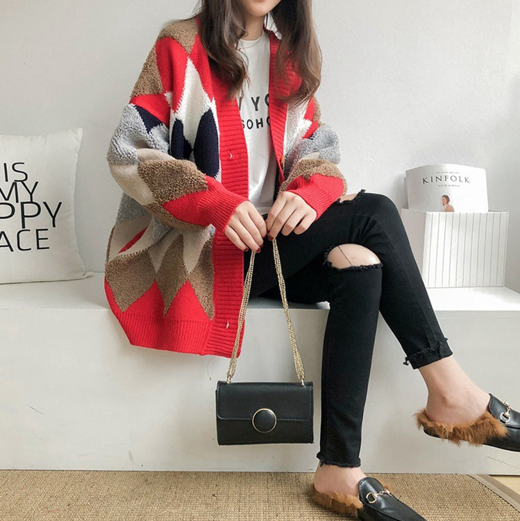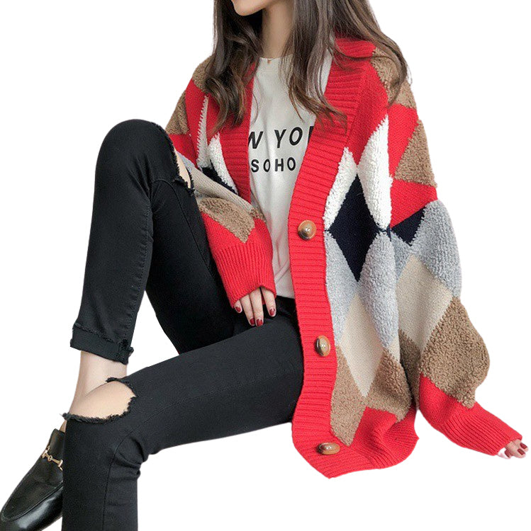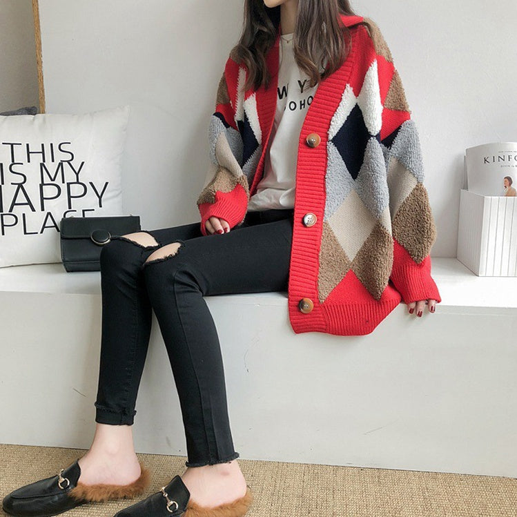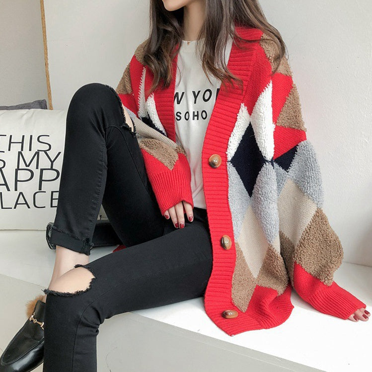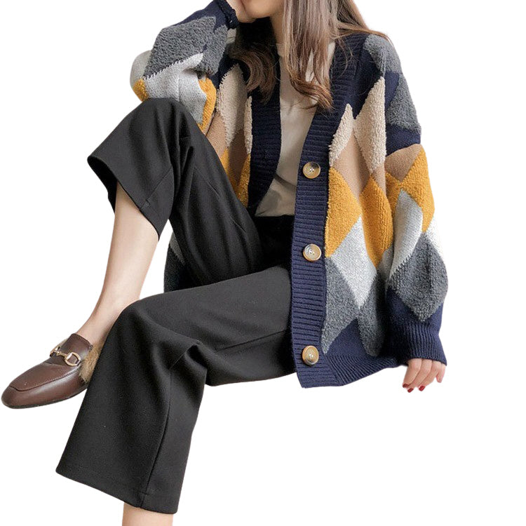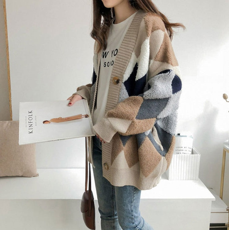 Casual V-neck Argyle Cardigans Womens Girls Korean England K-pop Style Winter Cozy Warm Loose fit Sweaters Tops Knit