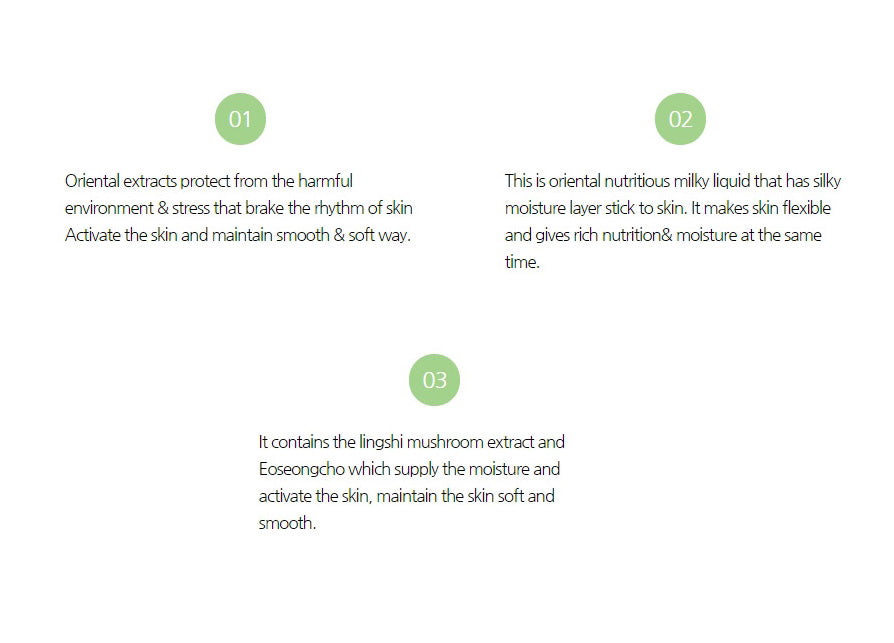 This is oriental nutritious milky liquid that has silky moisture layer stick to skin. It makes skin flexible and gives rich nutrition& moisture at the same time.
