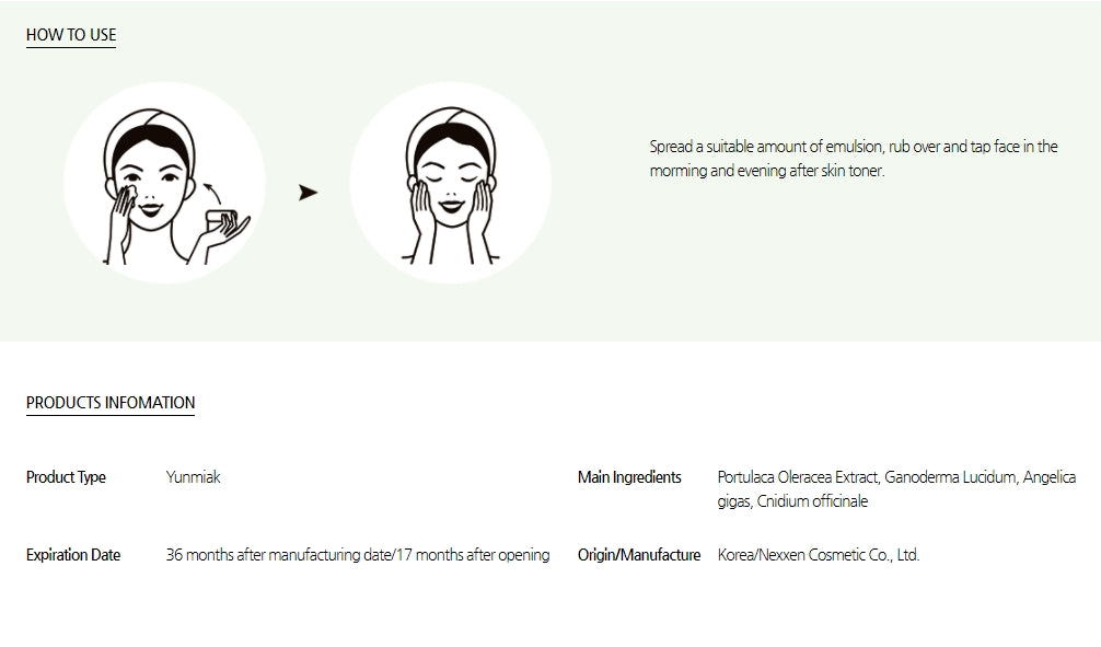 How to use: Spread a suitable amount of emulsion, rub over and tap face in the morming and evening after skin toner.