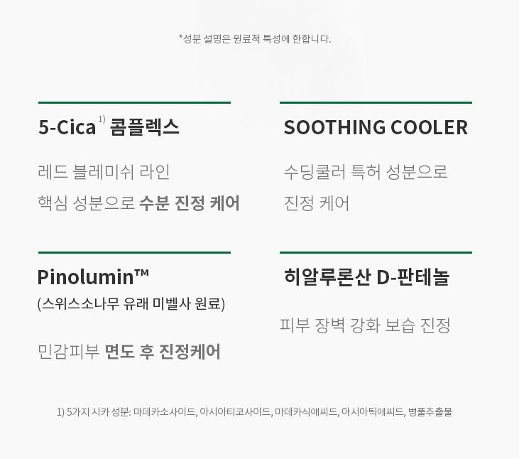 Ingredients: Purified water, propanediol, 1,2-hexanediol, betaine, panthenol, butylene glycol, galactoarabinan, pentylene glycol, maltodextrin, glycerin, allantoin, aloe vera leaf extract, kelp extract, yam Root extract, elm root extract, violet flower extract, hydroxyphenylpropamidobenzoic acid, disodium EDTA, sodium hyaluronate, holly holly leaf extract, medicinal wool extract, european larch extract, Beta-glucan, tea tree leaf extract, ascorbyl palmitate, sea holly extract, yarrow extract, ethylhexyl glycerin, centella asiatica extract, madecassoside, asiaticoside, asiatic acid, madecassic acid