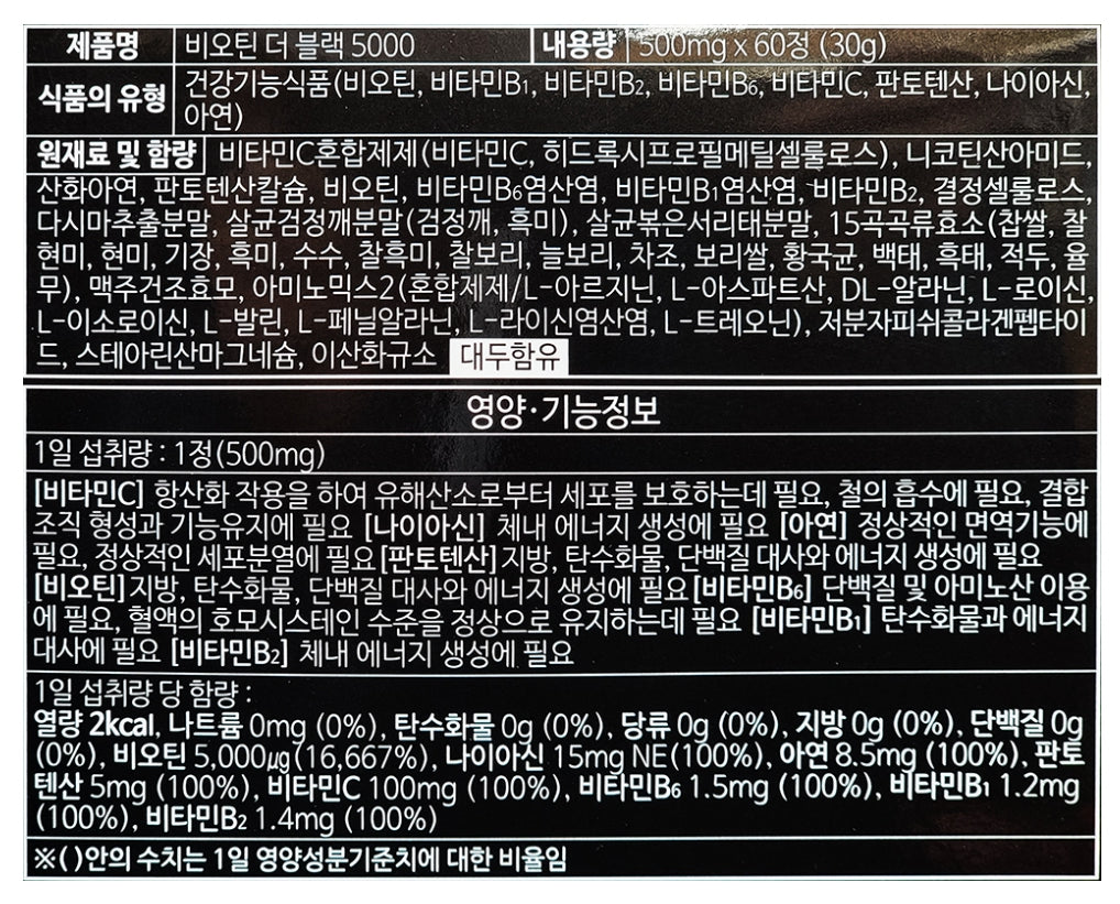 Ingredients: Vitamin C mixture (vitamin C, hydroxypropylmethylcellulose), nicotinic acid amide, zinc oxide, calcium pantothenate, biotin, vitamin B6 hydrochloride, vitamin B1 hydrochloride, vitamin B2, crystalline cellulose, kelp extract powder, sterilization black sesame powder (black sesame, black rice), sterilized roasted fermented rice flour, 15 grain enzymes (glutinous rice, brown rice, brown rice, millet, black rice, sorghum, black rice, glutinous barley, sloth barley, perilla, barley rice, yellow bean sprouts, white rice, black rice, red bean, yul Radish), brewer's yeast, Amino Mix 2 (mixed formulation/L-arginine, L-aspartic acid, DL-alanine, L-leucine, L-isoleucine, L-valine, L-phenylalanine, L-lysine hydrochloride , L-threonine), low molecular weight fish collagen peptide, magnesium stearate, silicon dioxide and soybean.