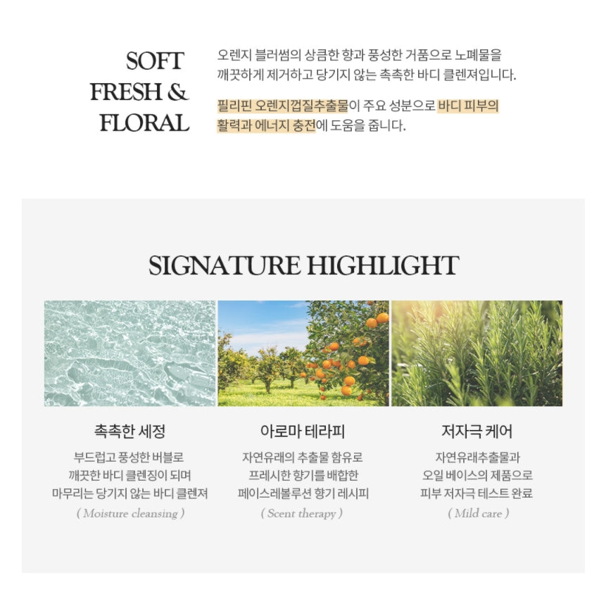 It is a moisturizing body cleanser that cleanly removes wastes with the fresh scent of orange blossom and rich bubbles and does not pull.