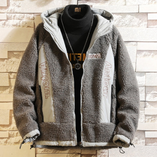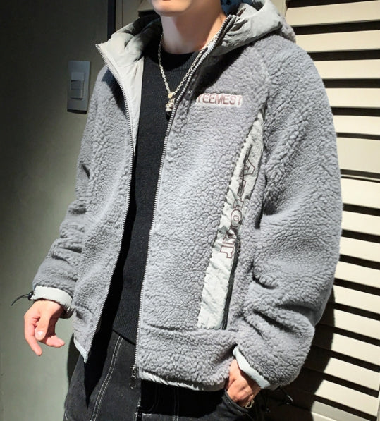 Stylish outerwear hooded jacket for men. Shearling hoodie with graphic logo, keep warm and stylish coats. Casual, hip-hop, kpop style fashionable streetwear.