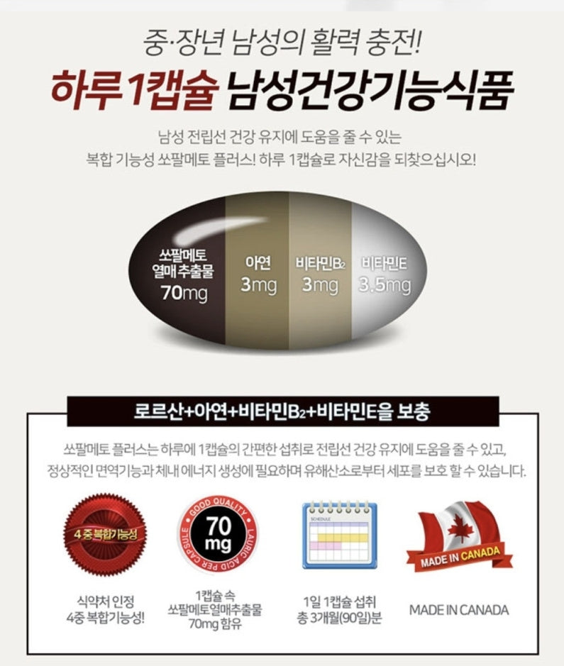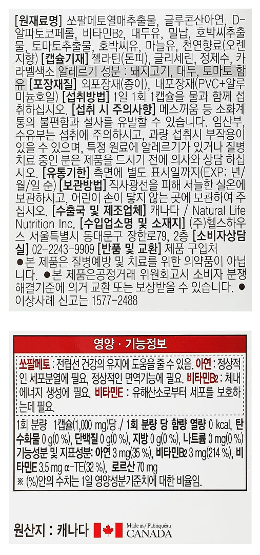 Ingredients: Saw palmetto fruit extract, zinc gluconate, D-alpha tocopherol, vitamin B2, soybean oil, beeswax, pumpkin seed extract, tomato extract, pumpkin seed oil, garlic oil, natural flavoring (oren-oriented) [Capsule base] Gelatin (pork skin) , Glycerin, Purified Water, Caramel Color Allergy Ingredients: Contains pork, soybean, tomato.