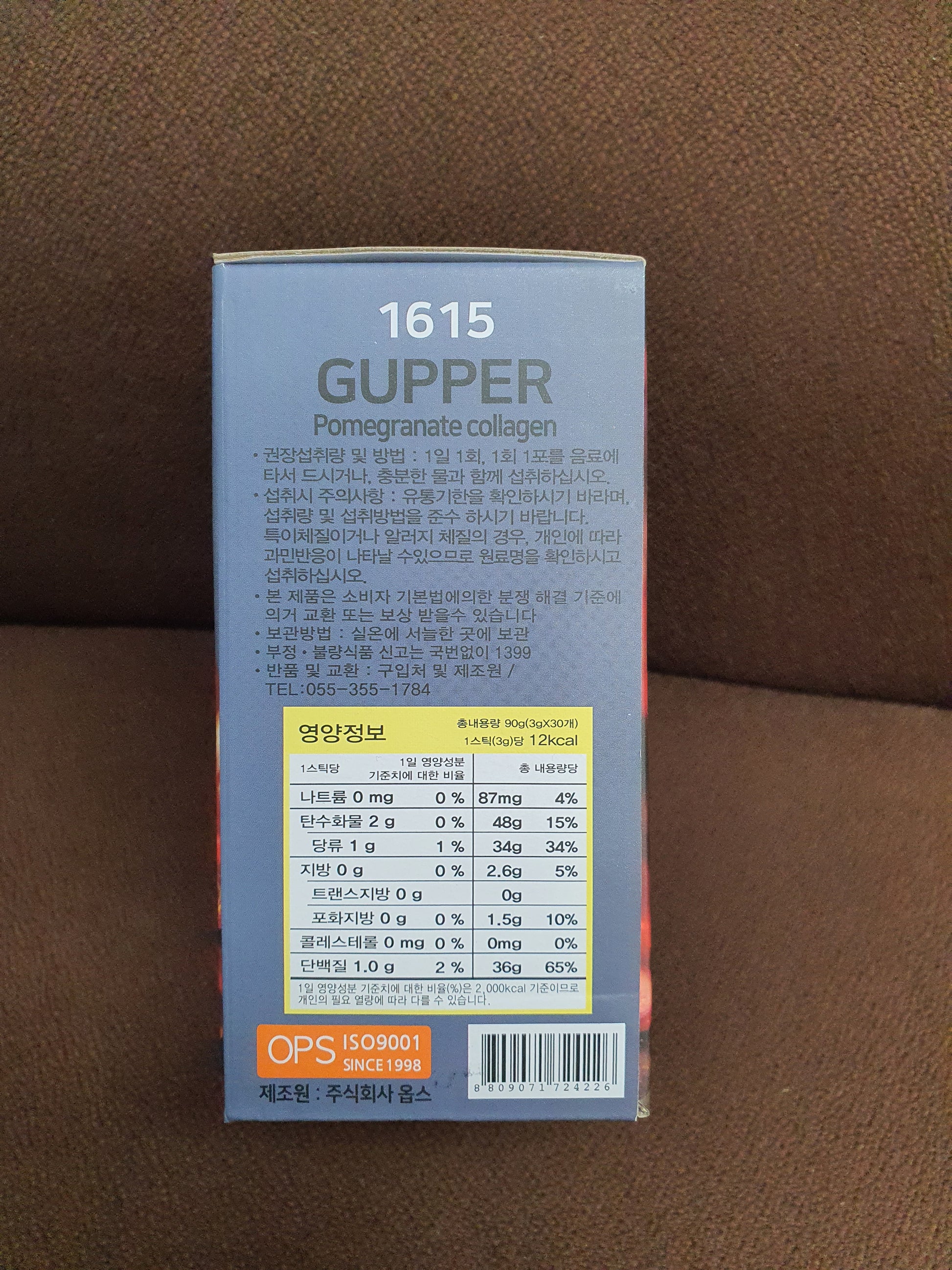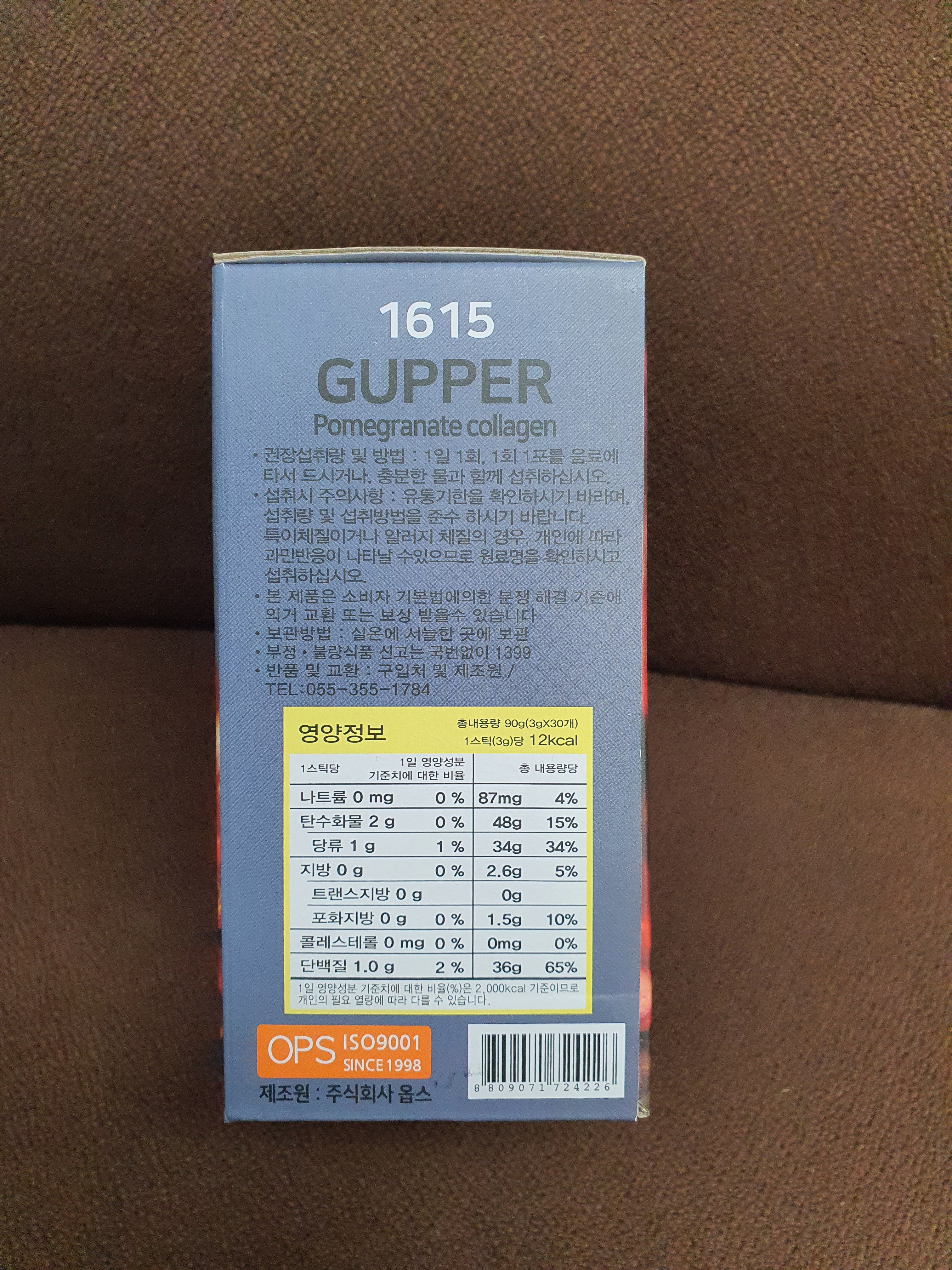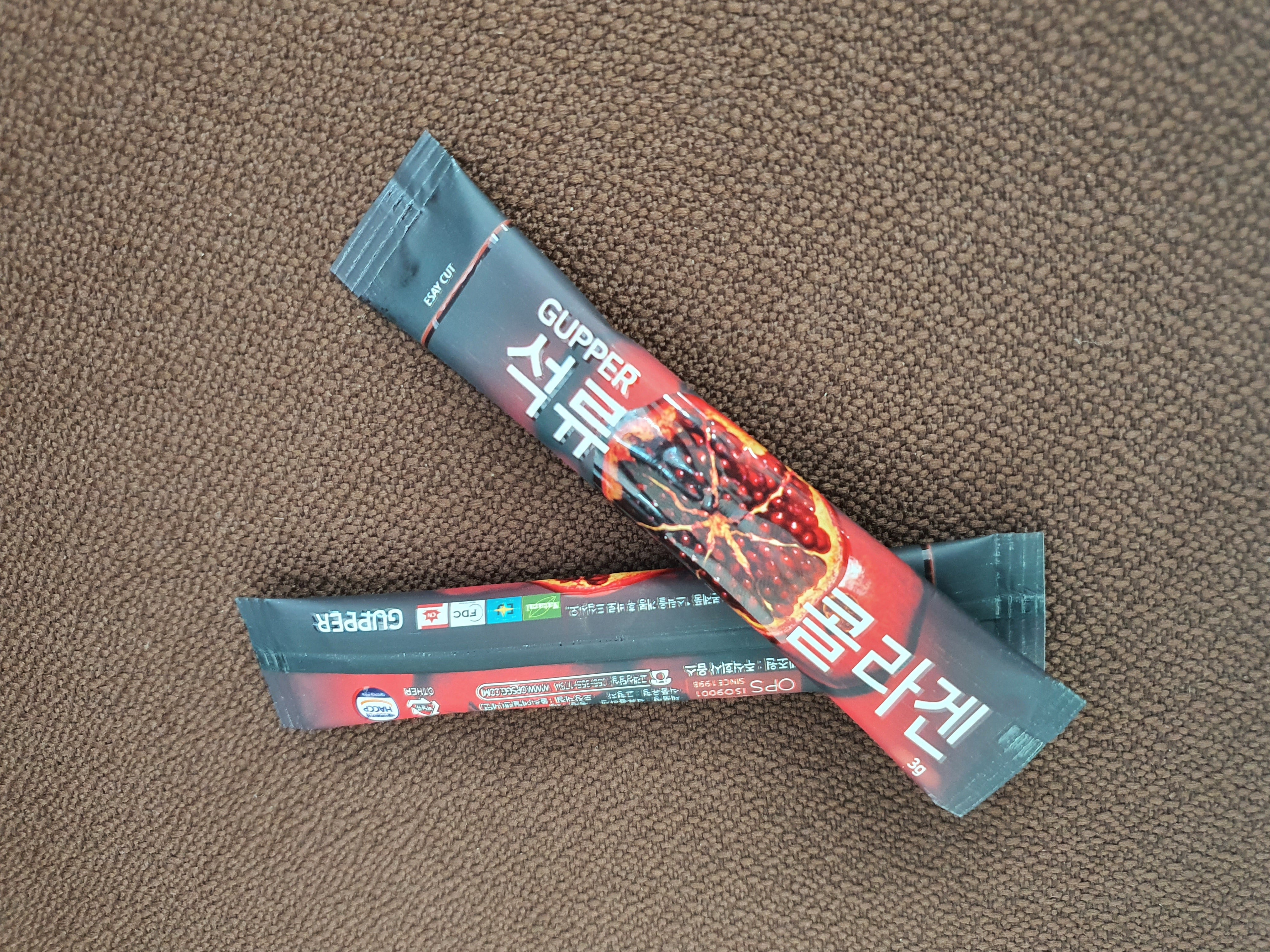 Ingredients: Fish collagen 37%, vegetable cream (starch syrup, vegetable oil (palm oil), whey powder, whey protein concentrate powder, dibasic potassium phosphate, silicon dioxide, lecithin (soybean), refined salt, synthetic flavor (milk flavor), vitamin B2), Glucose, Pomegranate Concentrate Powder [Pomegranate Juice Concentrate (solids 50%) Iranic Acid/Pomegranate Concentrated Fruit Juice 100%) 40%, Dextrin 60%], Xylitol, Synthetic Flavoring (Pomegranate Flavor), Vitamin C, Hyaluronic Acid, Vitamin Mix Formulations [containing soy, milk].